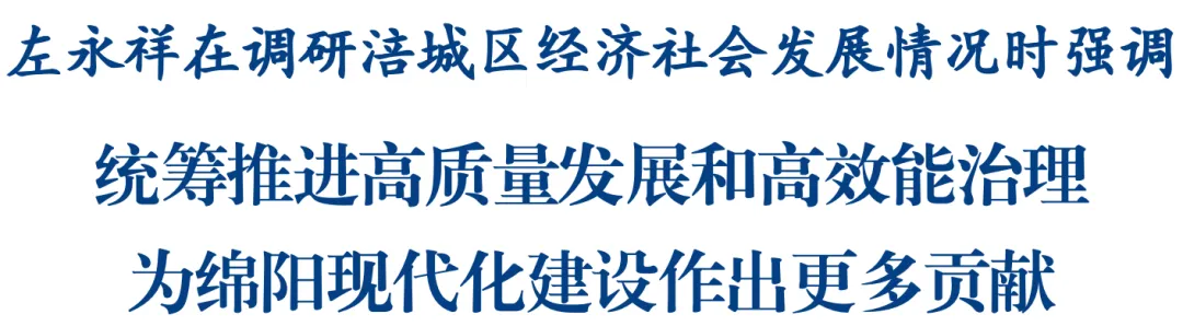 9月24日,省委常委、市委書(shū)記左永祥調(diào)研涪城區(qū)經(jīng)濟(jì)社會(huì)發(fā)展情況。他強(qiáng)調(diào),要深入學(xué)習(xí)貫徹習(xí)近平總書(shū)記對(duì)四川工作系列重要指示精神,全面落實(shí)黨中央、國(guó)務(wù)院和省委、省政府部署要求,錨定“走在前、挑大梁”,統(tǒng)籌推進(jìn)高質(zhì)量發(fā)展和高效能治理,為綿陽(yáng)現(xiàn)代化建設(shè)作出更多貢獻(xiàn)。