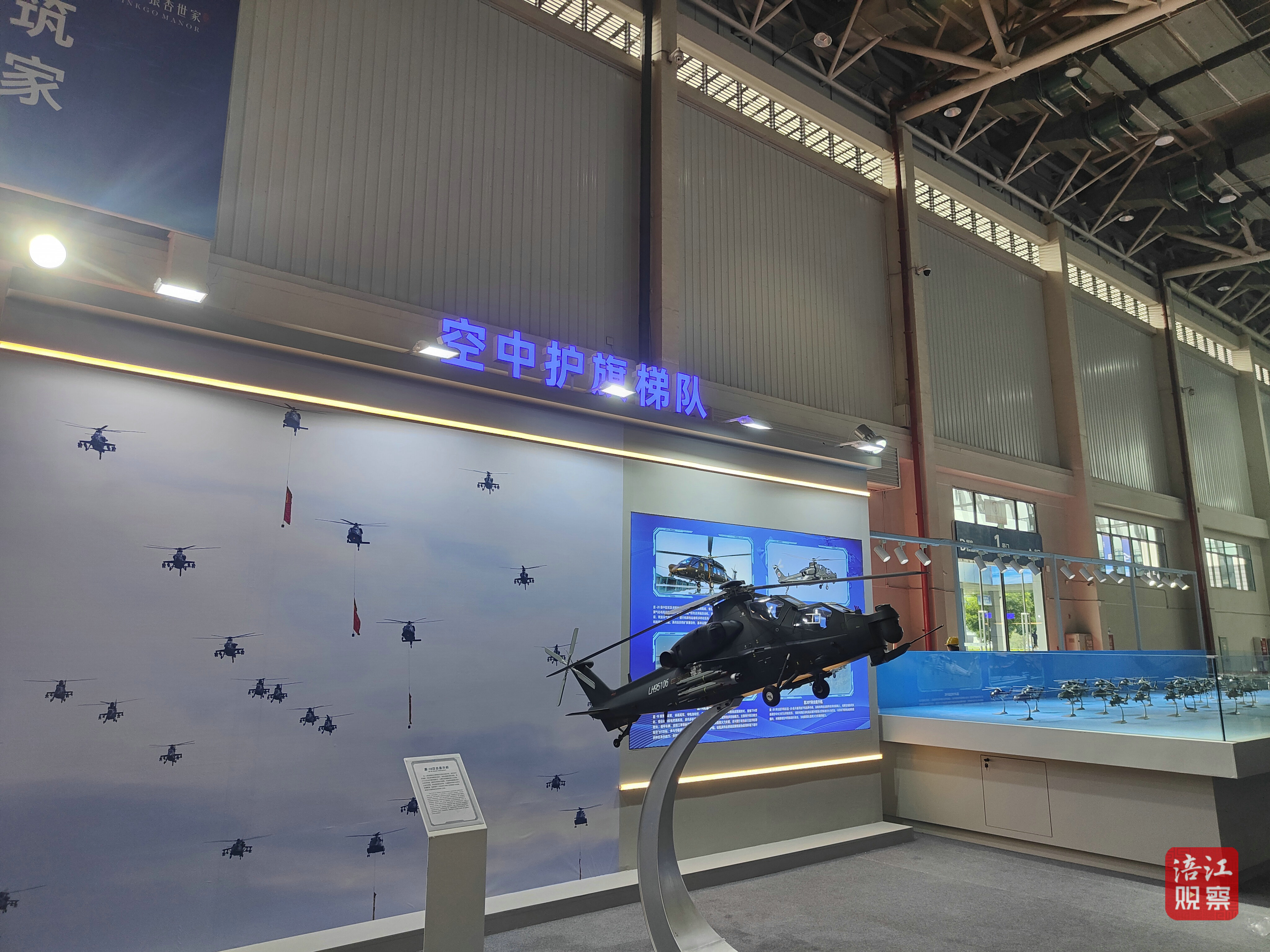 首先映入眼簾的是四架全尺寸飛機(jī)模型,分別是FC-31“鶻鷹”戰(zhàn)斗機(jī)、翼龍無人機(jī)、直-10武裝直升機(jī)、殲-15艦載戰(zhàn)斗機(jī)。在它們的周圍,今年九三閱兵梯隊(duì)主題展也即將布置結(jié)束,模型+圖文介紹的形式將全景式展現(xiàn)我國航空工業(yè)的輝煌成就。