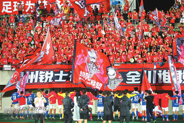 比賽結(jié)束后,綿陽隊球員集體向球迷致謝