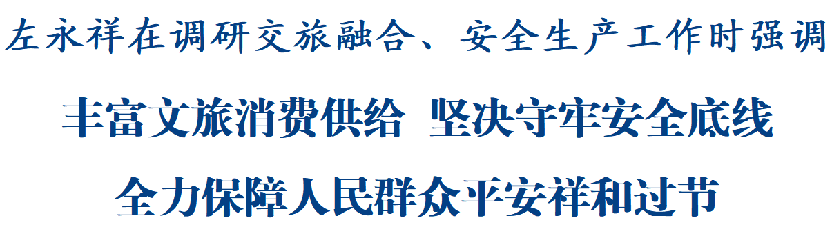 綿陽新聞網(wǎng)訊 9月29日下午,省委常委、市委書記左永祥調(diào)研交旅融合、安全生產(chǎn)工作。他強(qiáng)調(diào),要深入貫徹習(xí)近平總書記重要指示精神,全面落實(shí)黨中央、國務(wù)院和省委、省政府部署要求,堅(jiān)持以人民為中心的發(fā)展思想,豐富文旅消費(fèi)供給、堅(jiān)決守牢安全底線,全力保障人民群眾平安祥和過節(jié)。