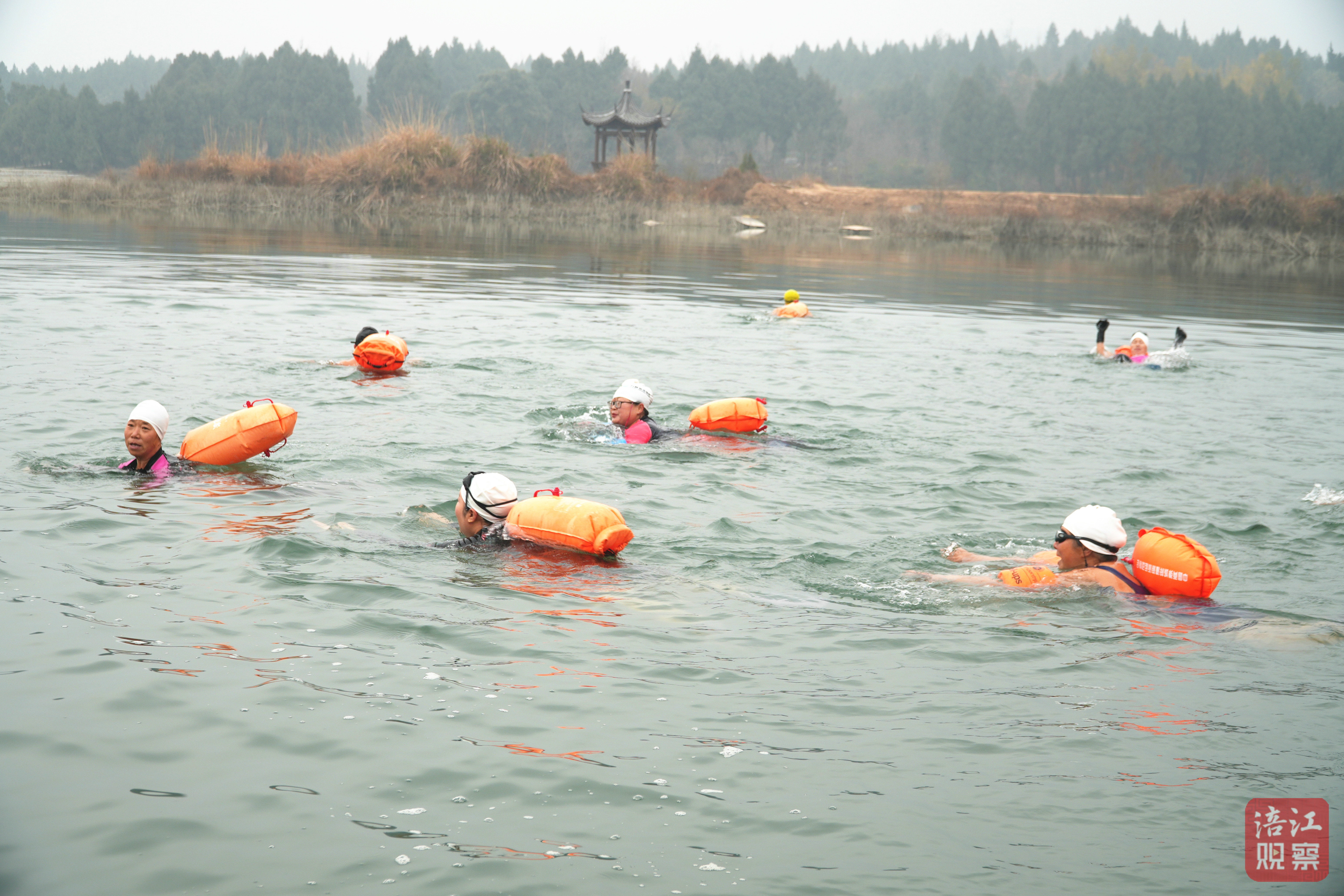 鳳凰湖水庫(kù)最寬處約800米。當(dāng)天,冬泳愛(ài)好者們?cè)趯I(yè)人員指導(dǎo)下,完成熱身運(yùn)動(dòng)后,躍入清澈的湖水中,有的蛙泳、有的仰泳、有的蝶泳、有的自由泳……直向?qū)Π稌秤味ァ?/p>