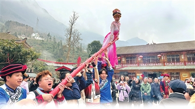 1月1日,北川石椅羌寨舉辦“徒步登山+非遺推桿競技”迎新活動,千余名羌族群眾與各地游客以運動健身、體驗非遺的方式,共同開啟健康向上的新年第一天。 記者 唐舒琪 攝