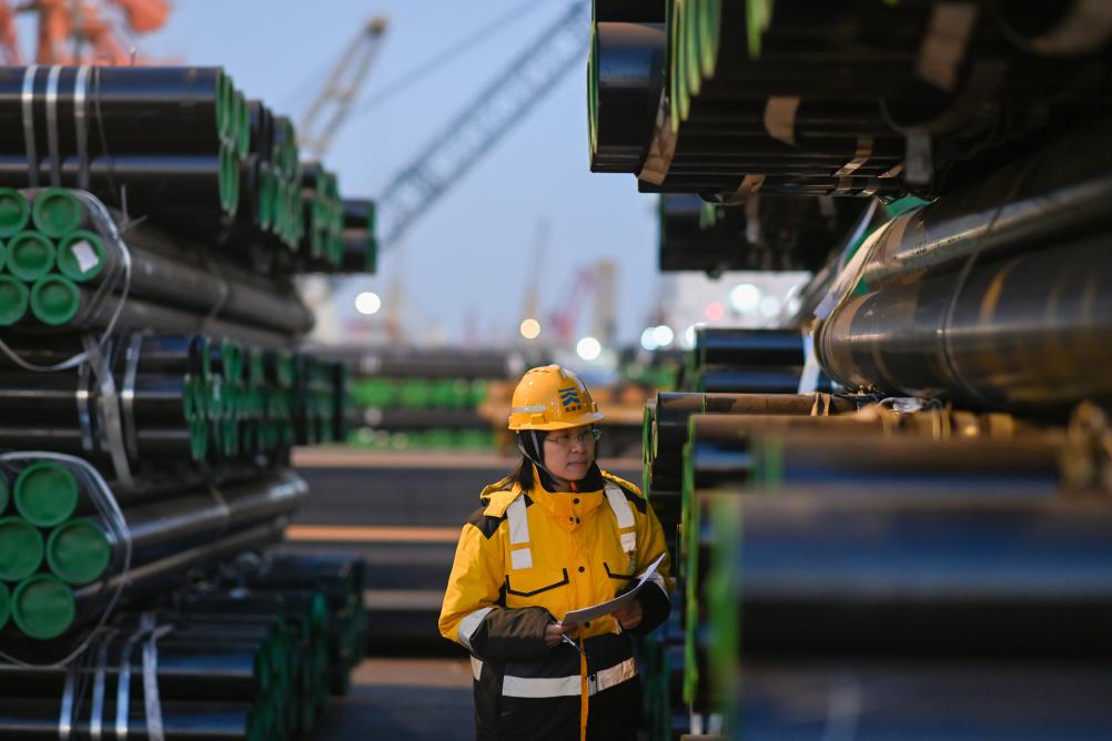 1月2日,在天津港第一港埠有限公司的碼頭貨場(chǎng),孟慶艷在清點(diǎn)貨物。新華社記者趙子碩攝