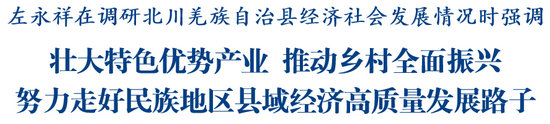 調(diào)研中,左永祥聽取了北川經(jīng)濟(jì)社會(huì)發(fā)展情況匯報(bào),對相關(guān)工作取得的成績給予肯定。他指出,北川生態(tài)稟賦良好、區(qū)位優(yōu)勢突出、民族特色鮮明,要發(fā)揮比較優(yōu)勢,精準(zhǔn)聚焦用力,切實(shí)把獨(dú)特的民族文化特色、優(yōu)良的山水生態(tài)資源轉(zhuǎn)化為現(xiàn)實(shí)生產(chǎn)力和發(fā)展競爭力。要推動(dòng)鄉(xiāng)村全面振興,總結(jié)用好先行區(qū)建設(shè)經(jīng)驗(yàn),以片區(qū)為單元推進(jìn)規(guī)劃、建設(shè),大力發(fā)展鄉(xiāng)村富民產(chǎn)業(yè),推動(dòng)農(nóng)村基礎(chǔ)設(shè)施完善、公共服務(wù)優(yōu)化、社會(huì)治理增效,以鄉(xiāng)村全面振興新成效回報(bào)習(xí)近平總書記的關(guān)心關(guān)懷和殷切期望。要培育特色優(yōu)勢產(chǎn)業(yè),在全市產(chǎn)業(yè)布局中找準(zhǔn)主攻方向和細(xì)分領(lǐng)域,加快培育壯大低空經(jīng)濟(jì),做深做實(shí)“文旅+”文章,多措并舉推動(dòng)一二三產(chǎn)業(yè)融合發(fā)展,筑牢縣域經(jīng)濟(jì)發(fā)展的產(chǎn)業(yè)支撐。要更好統(tǒng)籌發(fā)展和安全,以“時(shí)時(shí)放心不下”的責(zé)任感,抓實(shí)抓細(xì)安全生產(chǎn)各項(xiàng)工作,牢牢守住生態(tài)保護(hù)紅線,確保社會(huì)安定有序,以高水平安全護(hù)航高質(zhì)量發(fā)展。要抓好“十五五”開局起步各項(xiàng)工作,全力以赴拼經(jīng)濟(jì)、抓項(xiàng)目、促發(fā)展,對照年度目標(biāo)細(xì)化分解任務(wù),一項(xiàng)一項(xiàng)抓好落實(shí),奮力奪取一季度“開門紅”,為實(shí)現(xiàn)全年目標(biāo)任務(wù)打下基礎(chǔ)、贏得主動(dòng)。