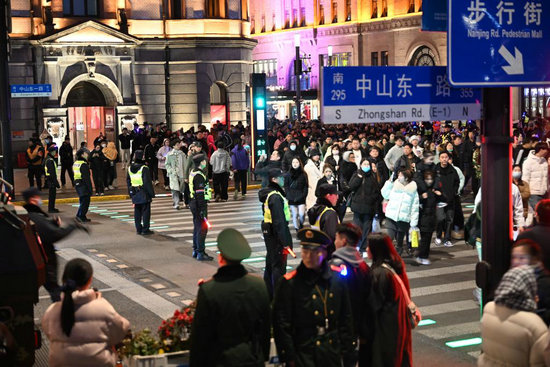 2025年12月31日晚,上海黃浦公安民警在外灘區(qū)域疏導(dǎo)交通。新華社發(fā)