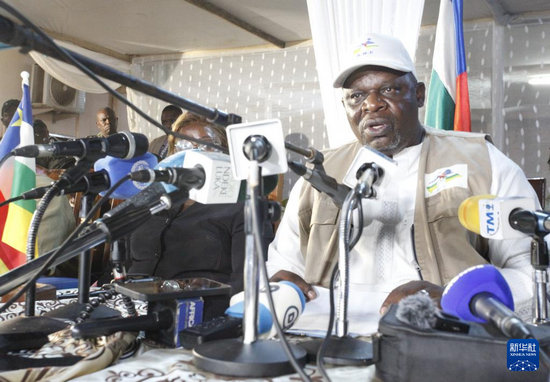 1月5日晚,在中非共和國(guó)首都班吉,國(guó)家選舉機(jī)構(gòu)主席馬蒂亞斯·巴泰勒米·莫魯巴宣讀總統(tǒng)選舉投票初步結(jié)果。新華社發(fā)