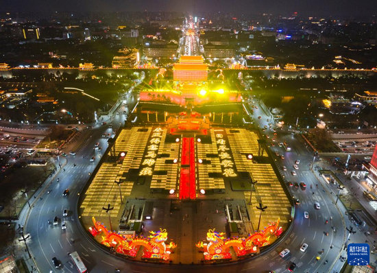 1月4日拍攝的西安城墻南門“長安燈會”景色(無人機(jī)照片)。