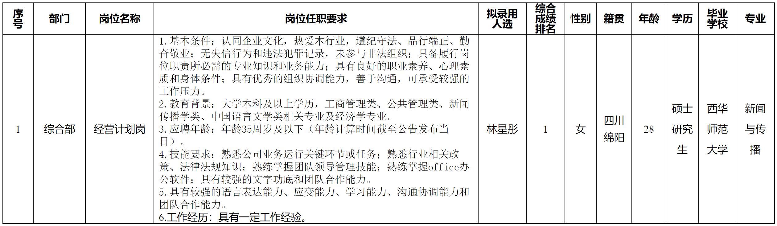 根據綿陽市城市停車管理有限公司發(fā)布的招聘公告及招聘相關規(guī)定,經筆試、面試、背調、體檢等程序,擬錄用林星彤到綿陽市城市停車管理有限公司工作,現(xiàn)予以公示,具體情況如下: