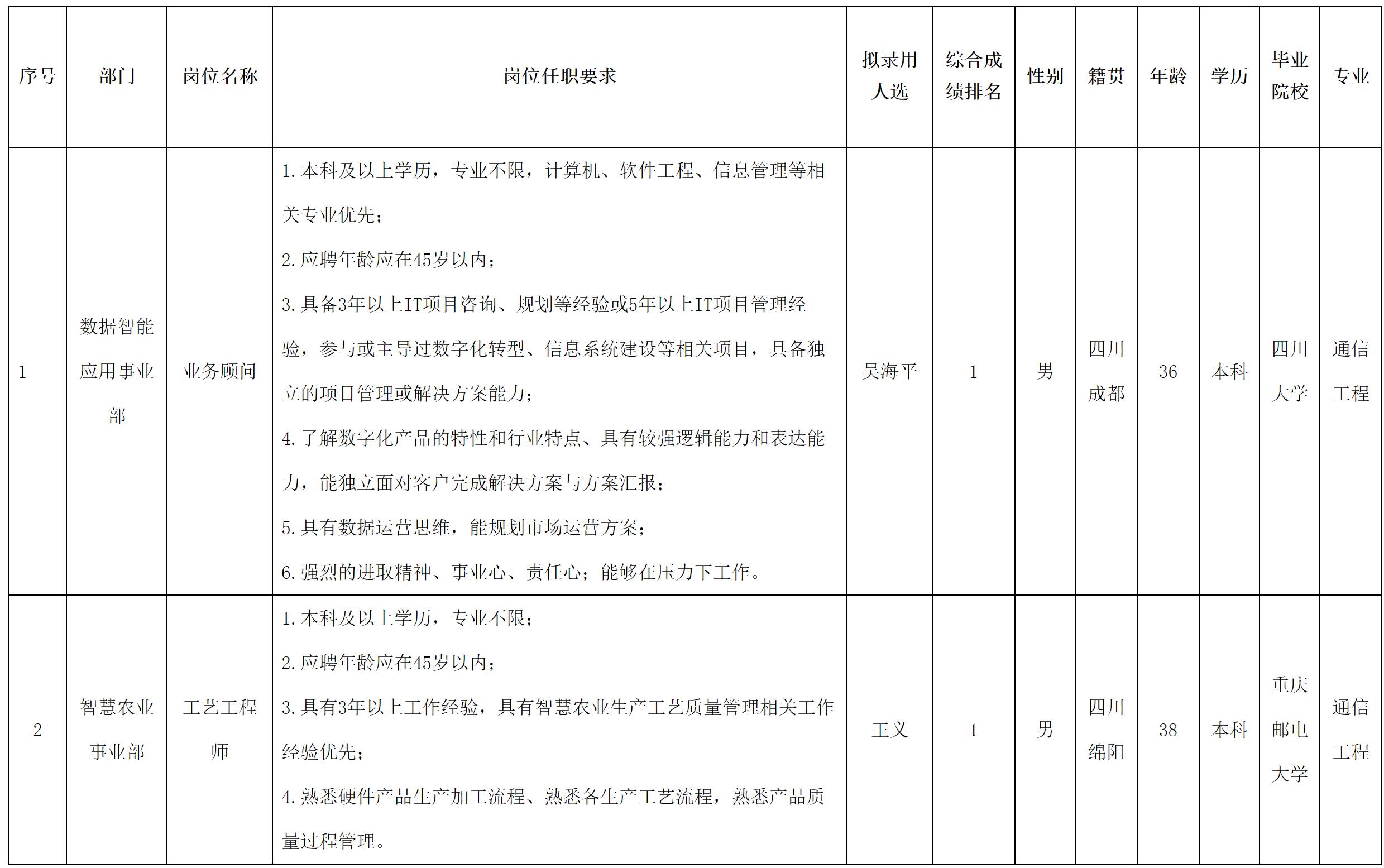 根據(jù)四川虹信軟件股份有限公司發(fā)布的招聘公告及招聘相關(guān)規(guī)定,經(jīng)測試、考察、體檢等程序,擬錄用吳海平、王義同志到四川虹信軟件股份有限公司工作,現(xiàn)予以公示,具體情況如下: