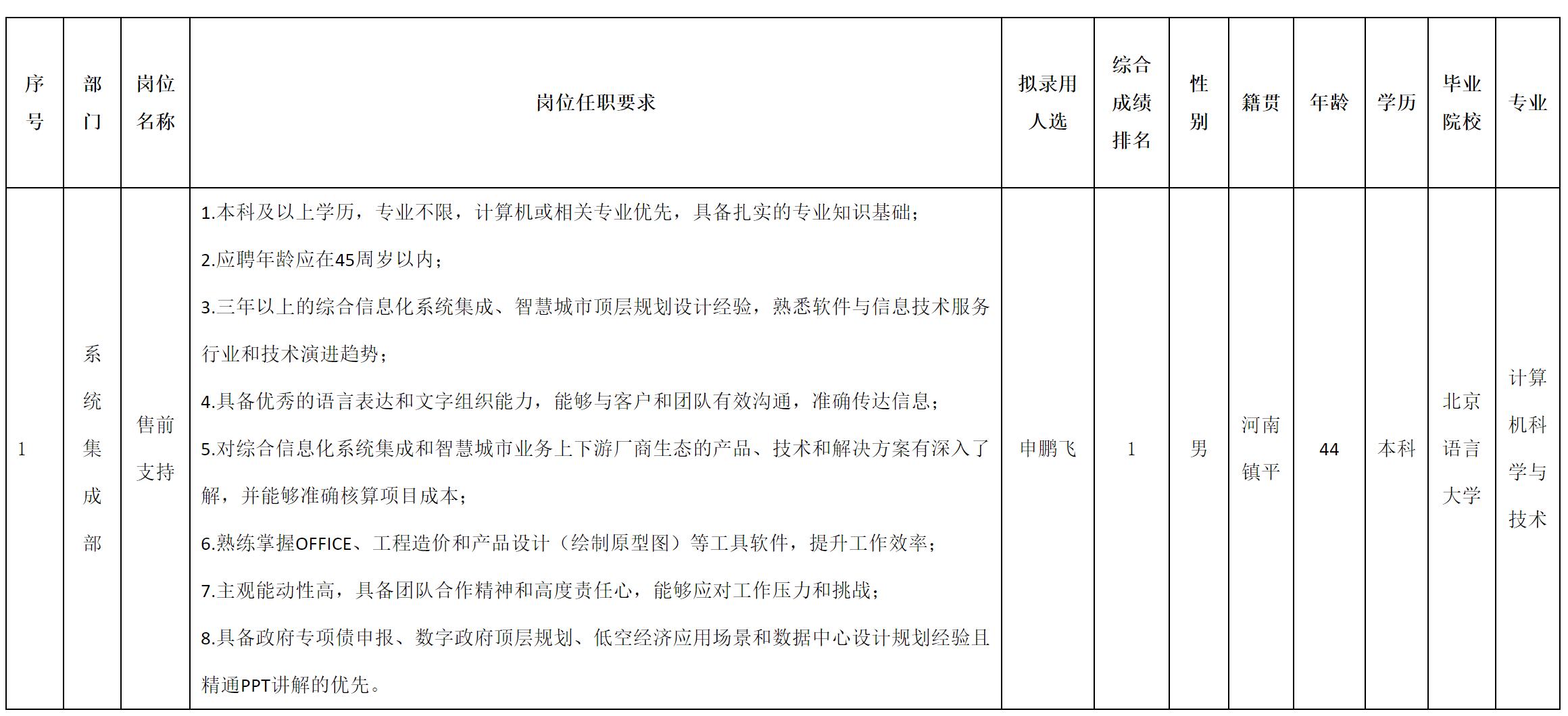 根據(jù)四川虹信軟件股份有限公司發(fā)布的招聘公告及招聘相關規(guī)定,經(jīng)測試、考察、體檢等程序,擬錄用申鵬飛同志到四川虹信軟件股份有限公司工作,現(xiàn)予以公示,具體情況如下: