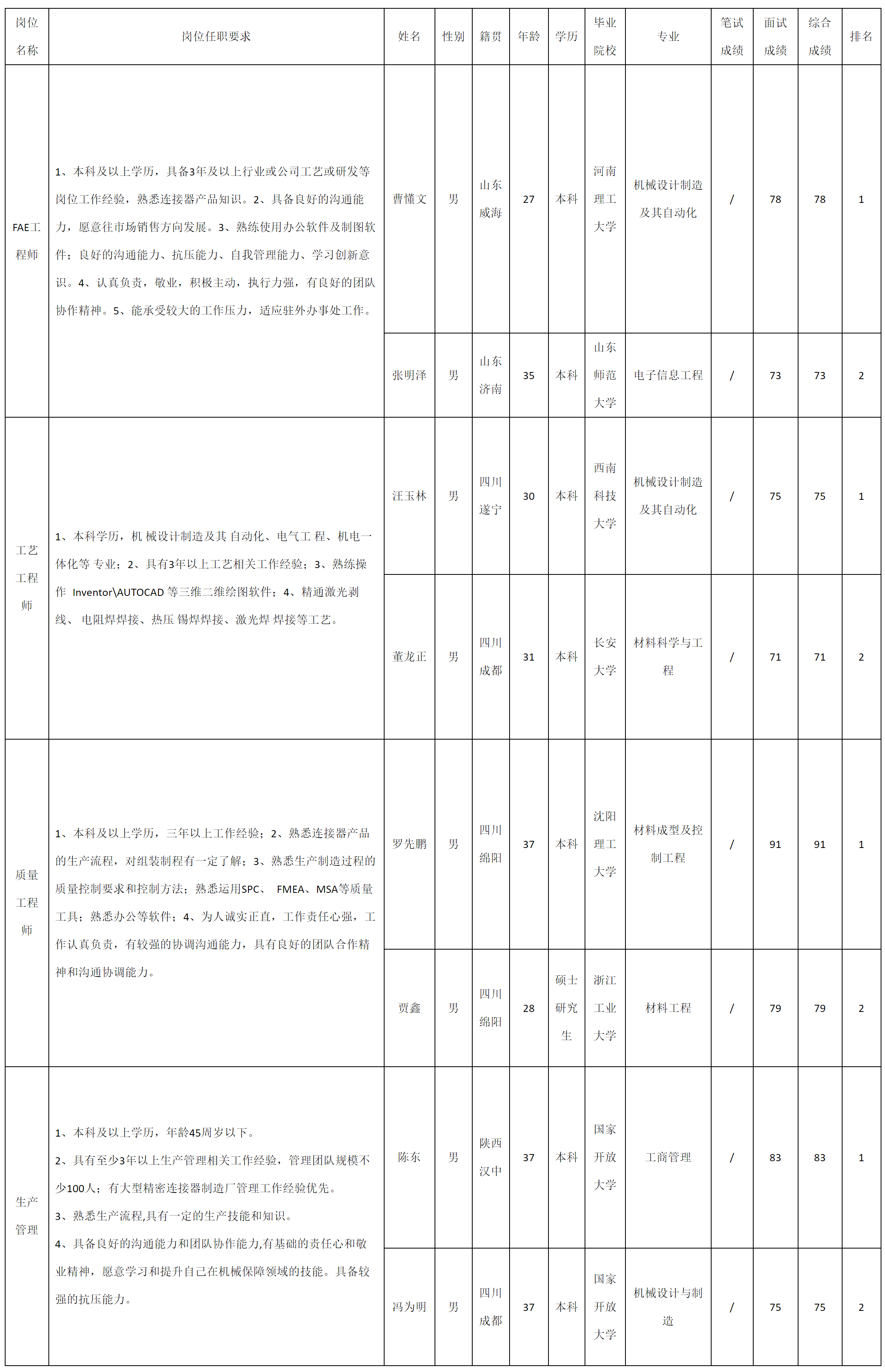 根據(jù)四川華豐科技股份有限公司發(fā)布的招聘公告及招聘相關(guān)規(guī)定,經(jīng)面試等程序,現(xiàn)將測試成績予以公示。