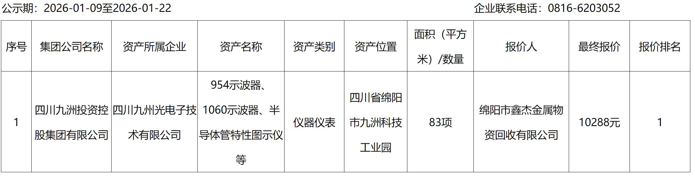 四川九州光電子技術有限公司儀器儀表處置結果公示