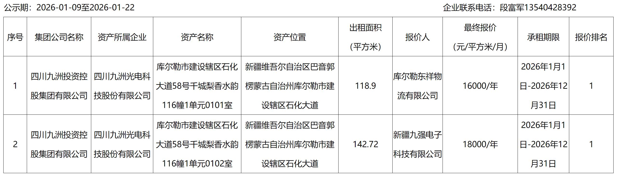 四川九洲光電科技股份有限公司資產(chǎn)出租結(jié)果公示