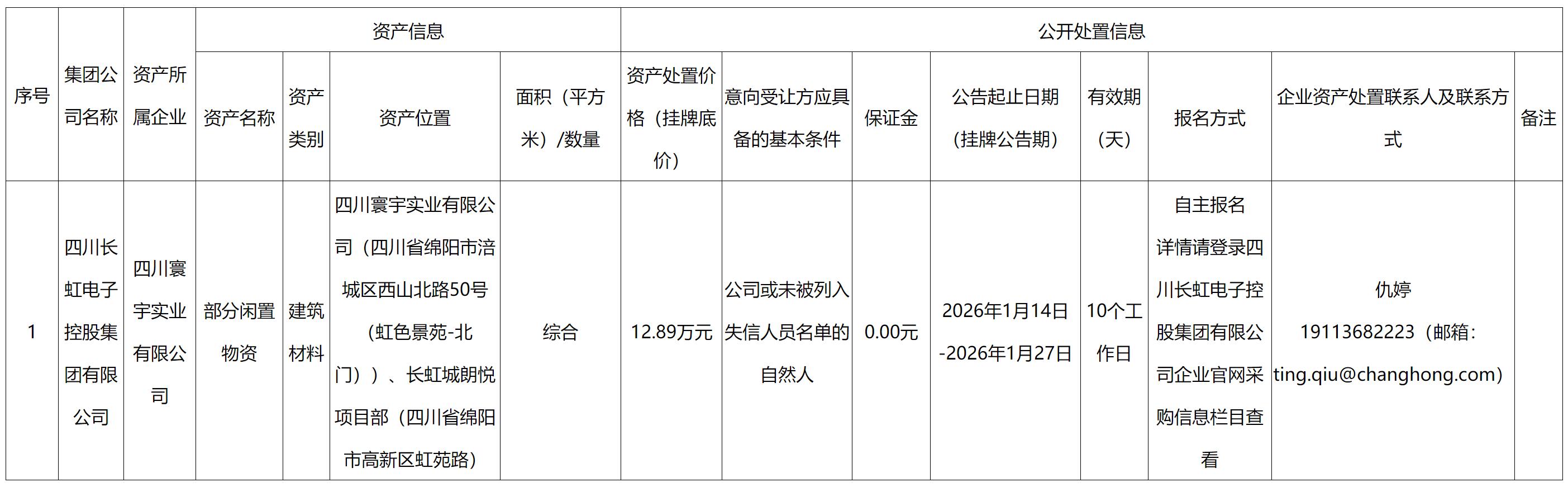 四川寰宇實業(yè)有限公司資產(chǎn)處置公告