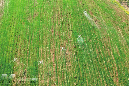 無人機(jī)“組團(tuán)”騰空而起,將藥霧精準(zhǔn)灑向麥苗。記者 劉鳳君 攝