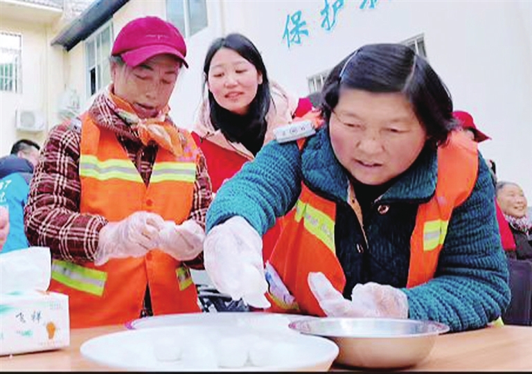環(huán)衛(wèi)工人在花荄鎮(zhèn)文星社區(qū)工會“愛心驛站”包湯圓。記者 安崢 攝