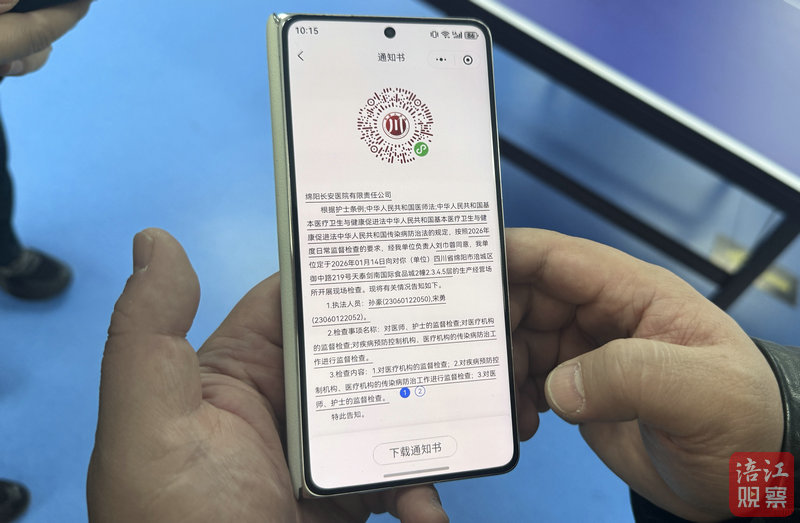 “您好,這是我們今天來檢查的二維碼,掃碼后可查看本次聯(lián)合檢查的全部信息。”近日,在綿陽市涪城長安醫(yī)院,涪城區(qū)衛(wèi)生健康局執(zhí)法人員孫豪出示手機里的專屬二維碼,醫(yī)院院長袁強掃碼后,檢查主體、執(zhí)法人員信息、檢查事項清單等核心內(nèi)容一目了然。
