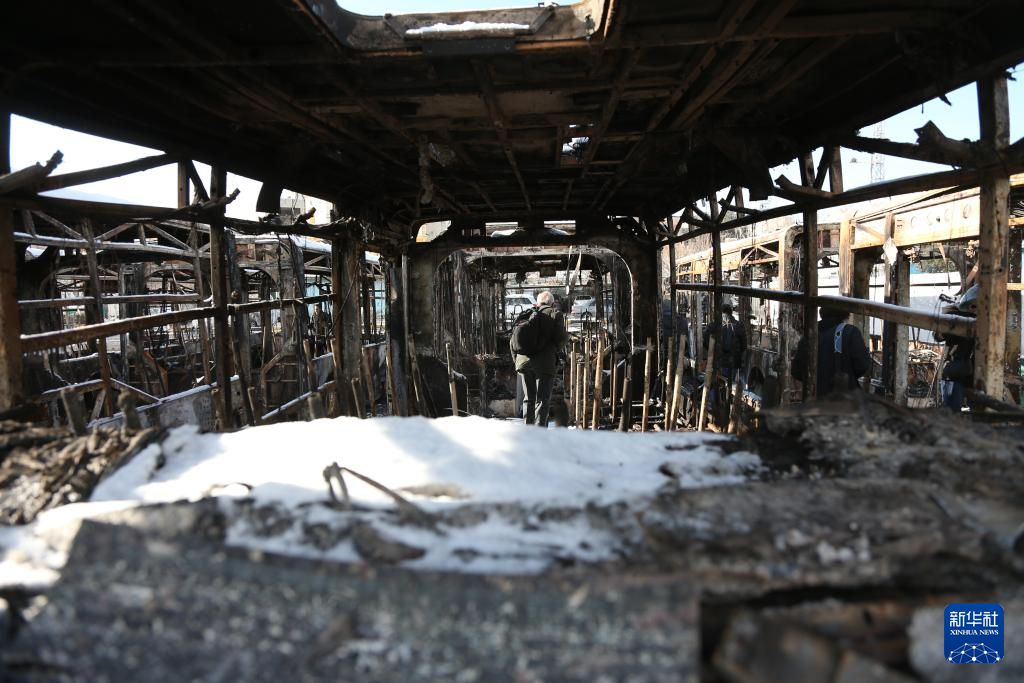1月21日,在伊朗首都德黑蘭,一名男子站在一輛于近期騷亂中被燒毀的公交車(chē)內(nèi)。新華社記者 沙達(dá)提 攝