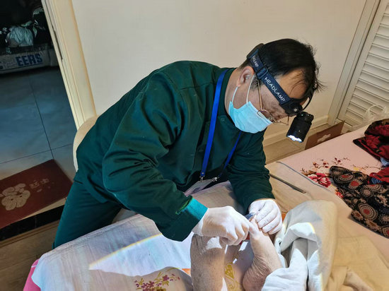 護(hù)理員王新中正在為侯阿姨的老伴提供修腳服務(wù)。受訪者供圖