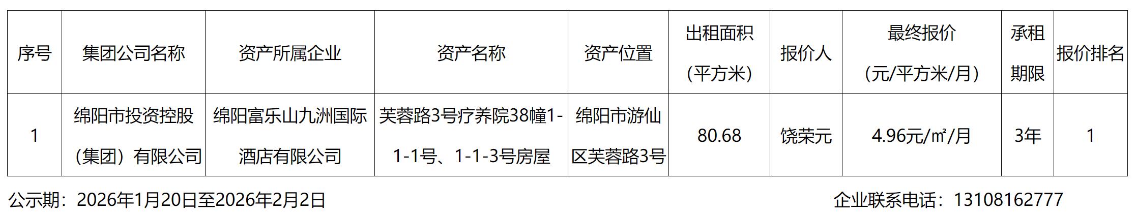 綿陽(yáng)富樂(lè)山九洲國(guó)際酒店有限公司資產(chǎn)出租結(jié)果公示