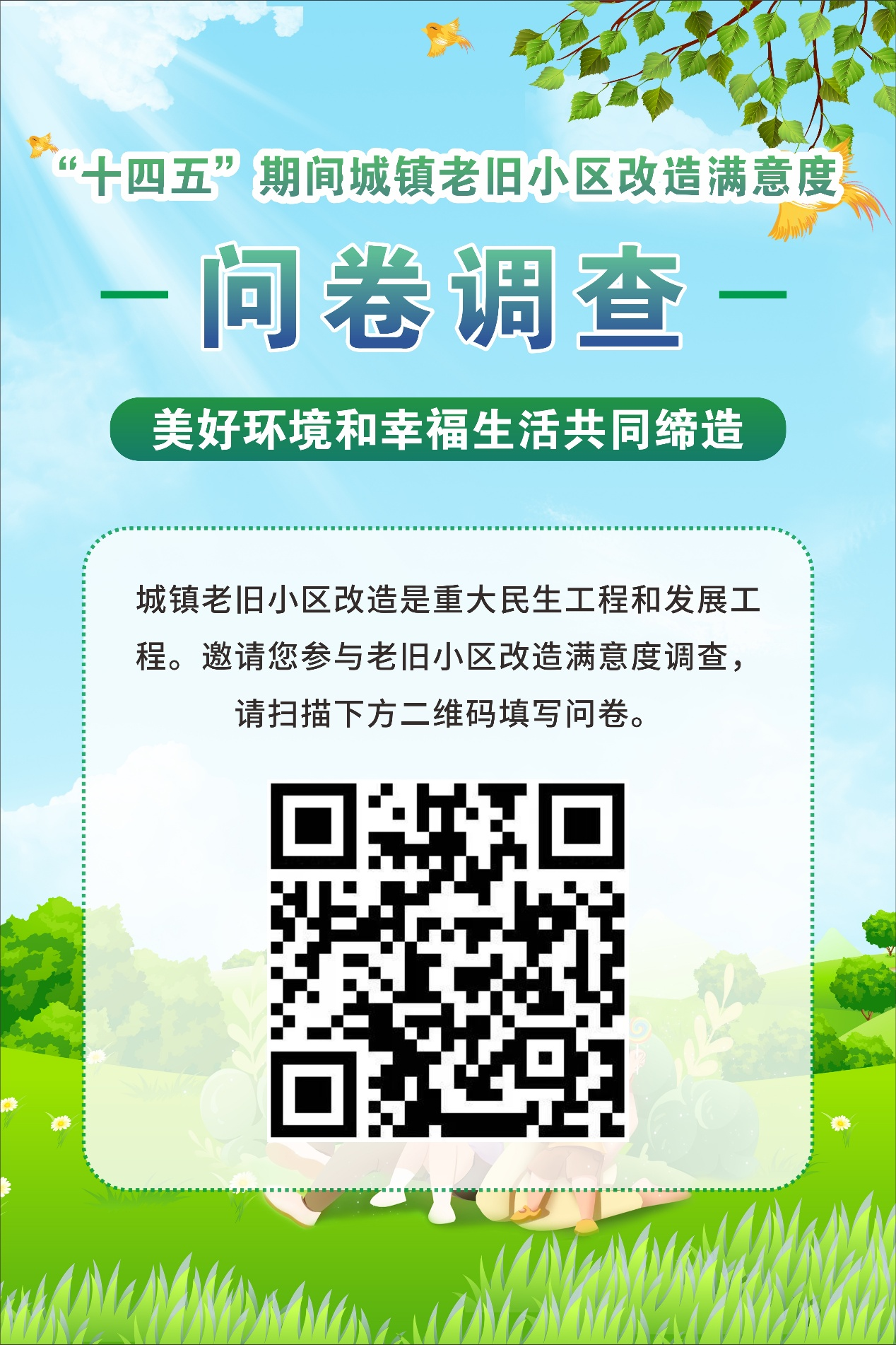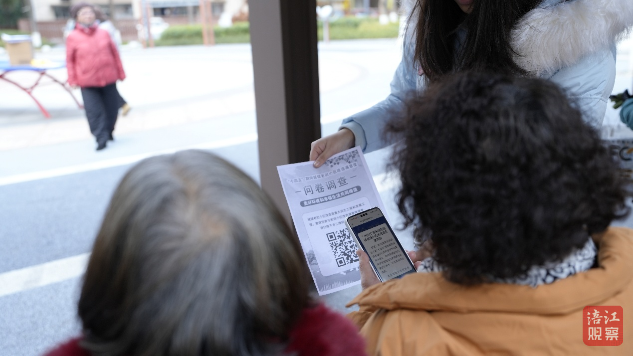 現(xiàn)場(chǎng),調(diào)查海報(bào)上寫著:“城鎮(zhèn)老舊小區(qū)改造是重大民生工程和發(fā)展工程,邀請(qǐng)您參與滿意度調(diào)查,請(qǐng)掃下方二維碼填寫問卷。”居民們正在工作人員的協(xié)助下掃碼填寫。