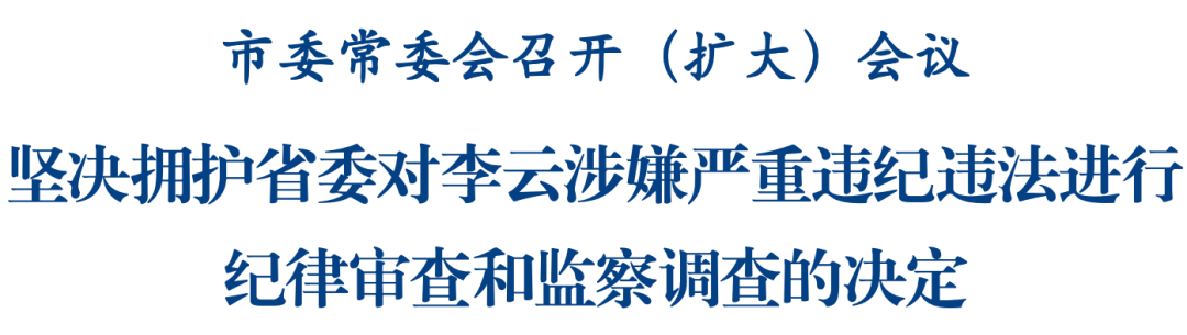 會(huì)議指出,省紀(jì)委監(jiān)委對(duì)李云涉嫌嚴(yán)重違紀(jì)違法進(jìn)行紀(jì)律審查和監(jiān)察調(diào)查,充分彰顯了省委持之以恒推進(jìn)全面從嚴(yán)治黨的堅(jiān)定決心和堅(jiān)強(qiáng)意志,再次釋放了違紀(jì)違法沒有安全地帶、一朝腐敗必將終身追責(zé)的強(qiáng)烈信號(hào),同時(shí)也反映出反腐敗斗爭形勢(shì)依然嚴(yán)峻復(fù)雜,鏟除腐敗滋生的土壤和條件仍然任重道遠(yuǎn)。市委堅(jiān)決擁護(hù)省委決定,堅(jiān)決擁護(hù)省紀(jì)委監(jiān)委決定,全力協(xié)助配合省紀(jì)委監(jiān)委開展審查調(diào)查。全市各級(jí)黨組織要切實(shí)把思想和行動(dòng)統(tǒng)一到黨中央關(guān)于全面從嚴(yán)治黨的部署要求上來、統(tǒng)一到省委決定精神上來,深刻汲取教訓(xùn),以案為鑒、警鐘長鳴,一體推進(jìn)不敢腐、不能腐、不想腐,堅(jiān)決打好反腐敗斗爭攻堅(jiān)戰(zhàn)、持久戰(zhàn)、總體戰(zhàn)。要堅(jiān)持用改革精神和嚴(yán)的標(biāo)準(zhǔn)管黨治黨,強(qiáng)化對(duì)“一把手”和領(lǐng)導(dǎo)班子的監(jiān)督,加大風(fēng)腐同查同治力度,使各項(xiàng)紀(jì)律規(guī)矩真正成為“帶電的高壓線”,確保黨和人民賦予的權(quán)力始終在正確的軌道上運(yùn)行。市政府黨組要堅(jiān)定不移貫徹全面從嚴(yán)治黨方針,以更高標(biāo)準(zhǔn)、更嚴(yán)要求加強(qiáng)自身建設(shè),做到按程序決策、按規(guī)矩辦事、按制度落實(shí),著力建設(shè)廉潔政府。要不斷增強(qiáng)推進(jìn)全面從嚴(yán)治黨、深化黨風(fēng)廉政建設(shè)的責(zé)任擔(dān)當(dāng),對(duì)職責(zé)范圍內(nèi)的問題敢管敢治、嚴(yán)管嚴(yán)治,緊盯權(quán)力集中、資金密集、資源富集的行業(yè)領(lǐng)域扎緊制度籠子,鏟除腐敗滋生土壤。廣大黨員干部要切實(shí)鑄牢對(duì)黨絕對(duì)忠誠的政治品格,堅(jiān)持不懈用黨的創(chuàng)新理論凝心鑄魂,鞏固拓展深入貫徹中央八項(xiàng)規(guī)定精神學(xué)習(xí)教育成果,嚴(yán)守政治紀(jì)律和政治規(guī)矩,始終做政治上的明白人、老實(shí)人。要始終保持對(duì)權(quán)力的敬畏感,帶頭尊崇黨章、遵守黨規(guī)黨紀(jì),堅(jiān)持依規(guī)依法開展工作,自覺做到秉公用權(quán)、依法用權(quán)、廉潔用權(quán)。要帶頭發(fā)揚(yáng)自我革命精神,從嚴(yán)要求自己,管好家屬和身邊工作人員,自覺接受監(jiān)督,自覺做到懷德自重、保持敬畏。