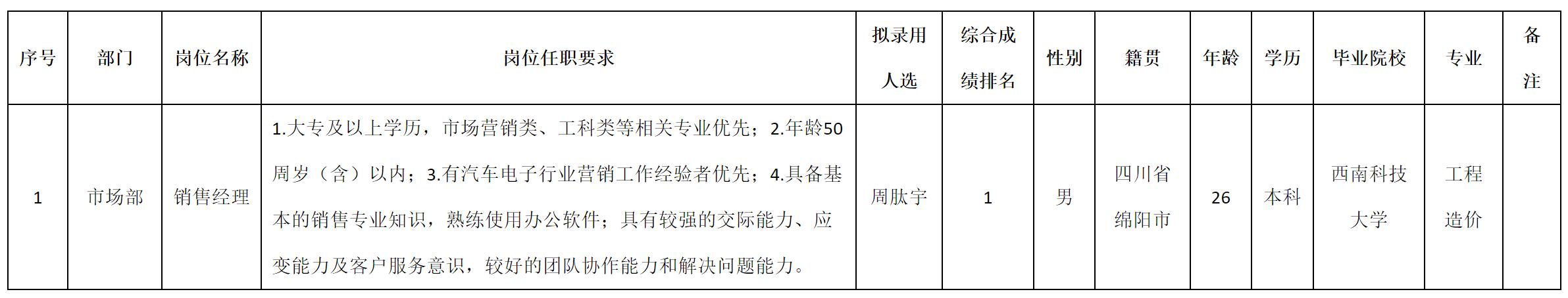 根據(jù)四川安和精密電子電器股份有限公司發(fā)布的招聘公告及招聘相關(guān)規(guī)定,經(jīng)測(cè)試、考察、體檢等程序,擬錄用周肽宇同志到四川安和精密電子電器股份有限公司工作,現(xiàn)予以公示,具體情況如下: