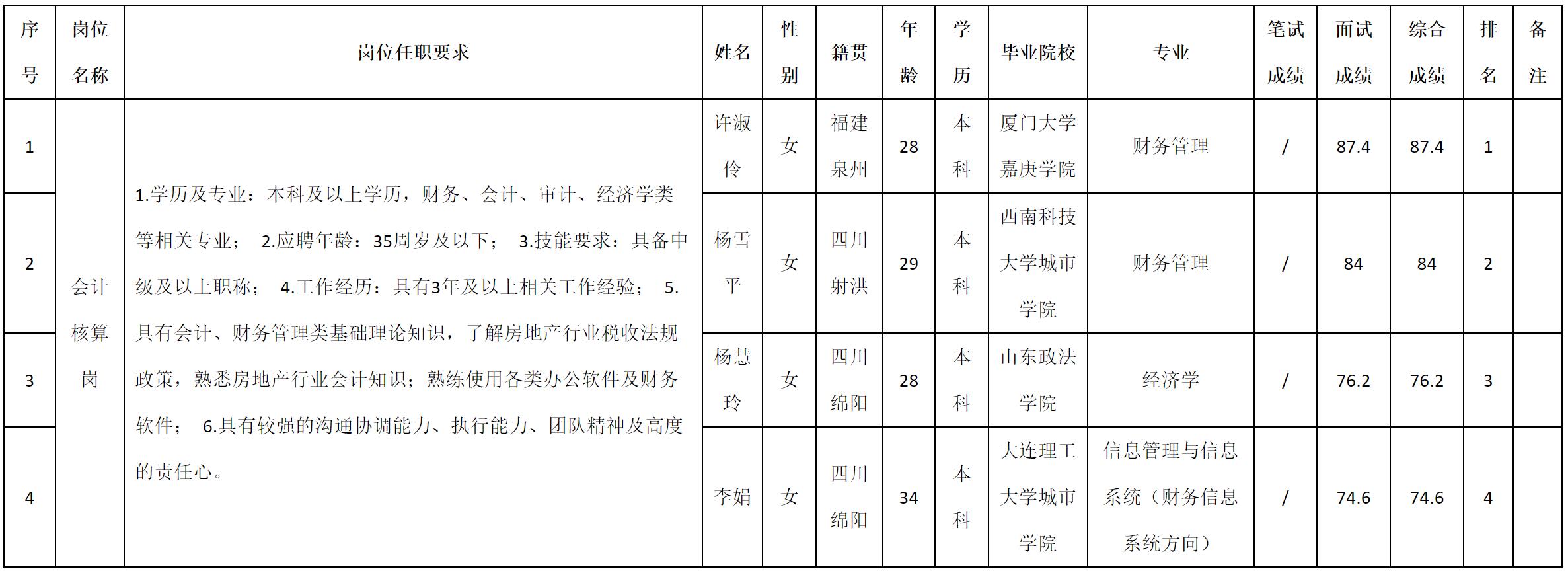 根據(jù)九洲千城置業(yè)有限責(zé)任公司發(fā)布的招聘公告及招聘相關(guān)規(guī)定,現(xiàn)將測試成績予以公示。