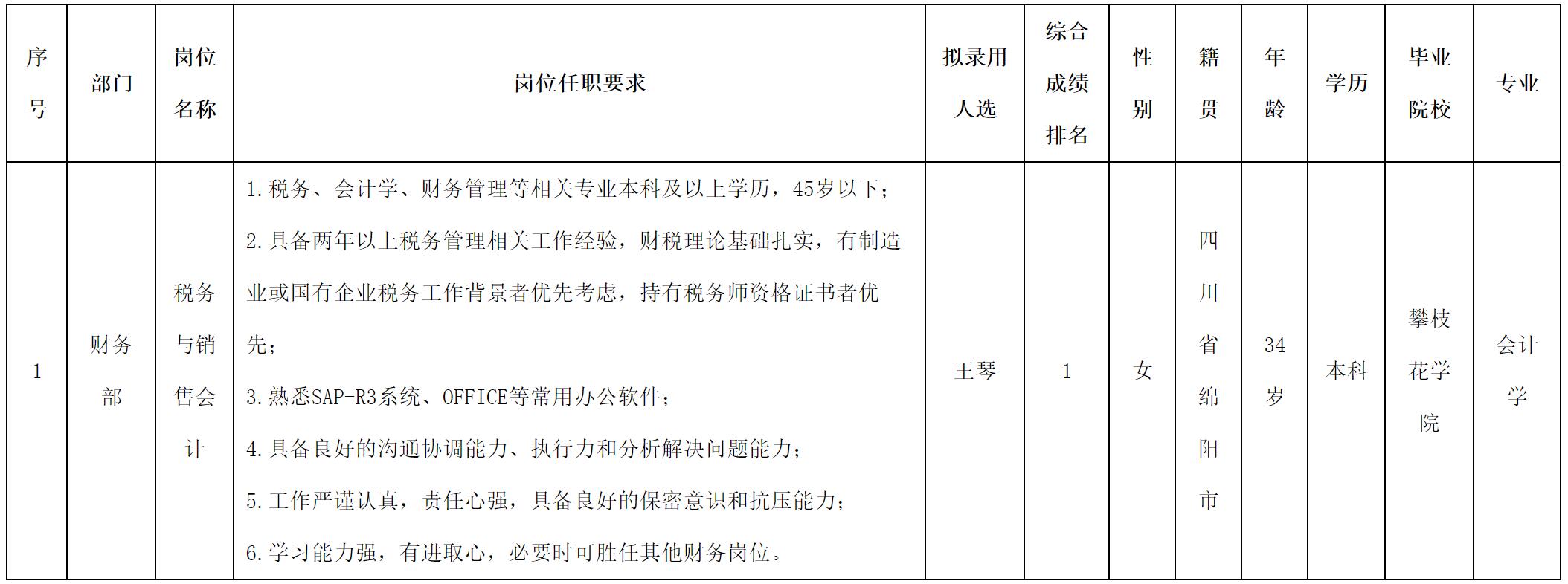 根據(jù)四川愛(ài)聯(lián)科技股份有限公司發(fā)布的招聘公告及招聘相關(guān)規(guī)定,經(jīng)面試,擬錄用王琴同志到財(cái)務(wù)部工作,現(xiàn)予以公示,具體情況如下: