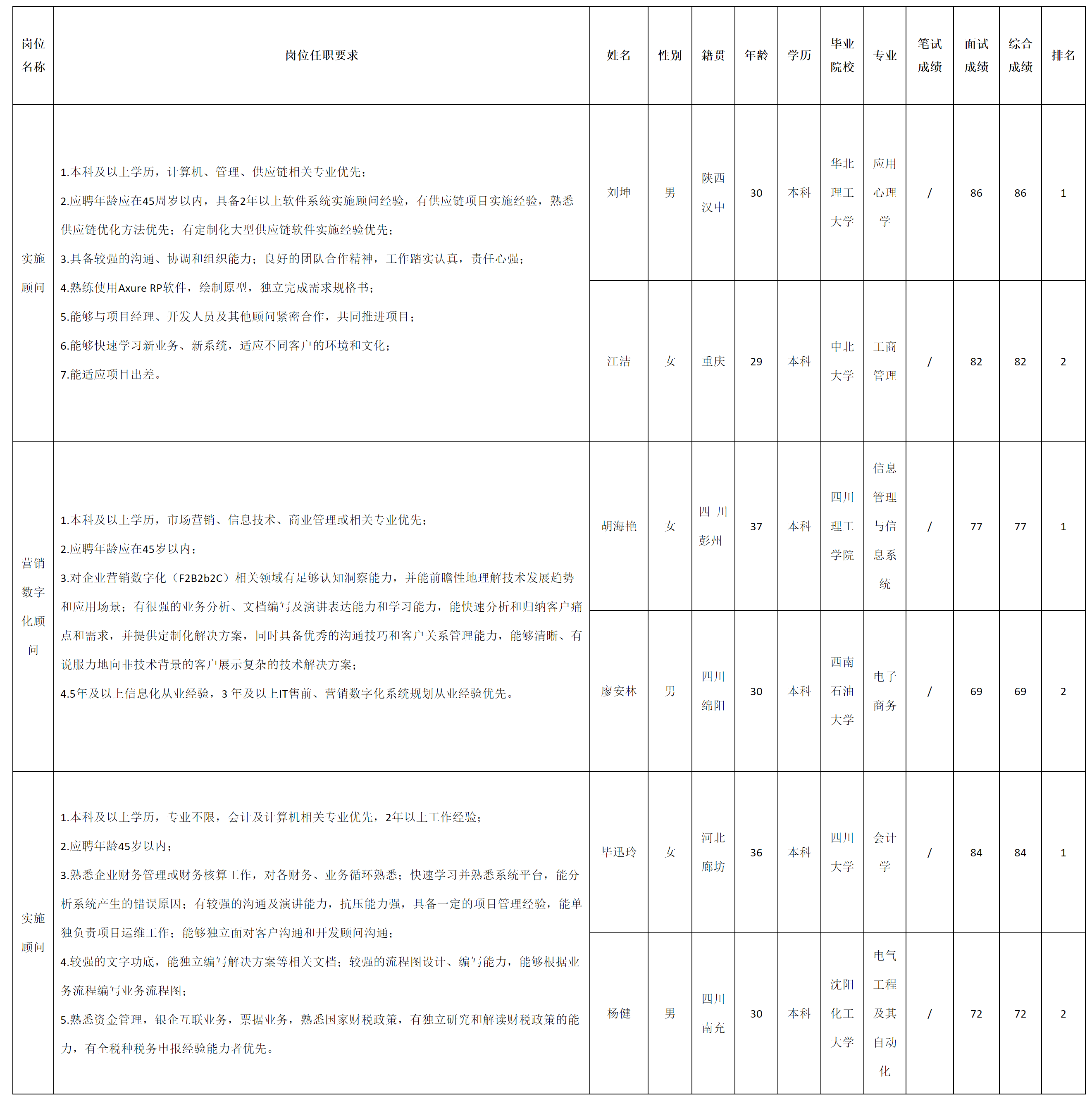 根據(jù)四川虹信軟件股份有限公司發(fā)布的招聘公告及招聘相關(guān)規(guī)定,經(jīng)面試等程序,現(xiàn)將測(cè)試成績(jī)予以公示。