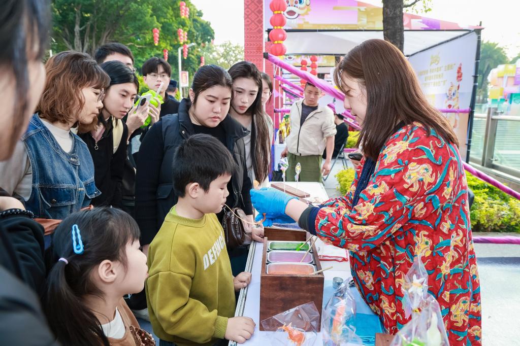 “慢慢吹,我來給你捏一個小豬。”在香港非物質(zhì)文化遺產(chǎn)辦事處的展位前,香港吹糖人師傅薛錦屏一邊為游客介紹吹糖人的歷史,一邊用糖料捏成各種生動造型。“我很喜歡這次活動的氛圍,除了讓大家體驗吹糖工藝,我也有機(jī)會去接觸全國各地的非遺項目,和其他傳承人相互交流。”薛錦屏說。