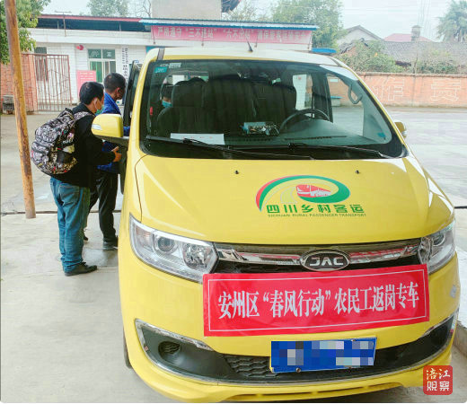 安州區(qū)“春風(fēng)行動(dòng)”中“小黃車”作為農(nóng)民工返崗專車