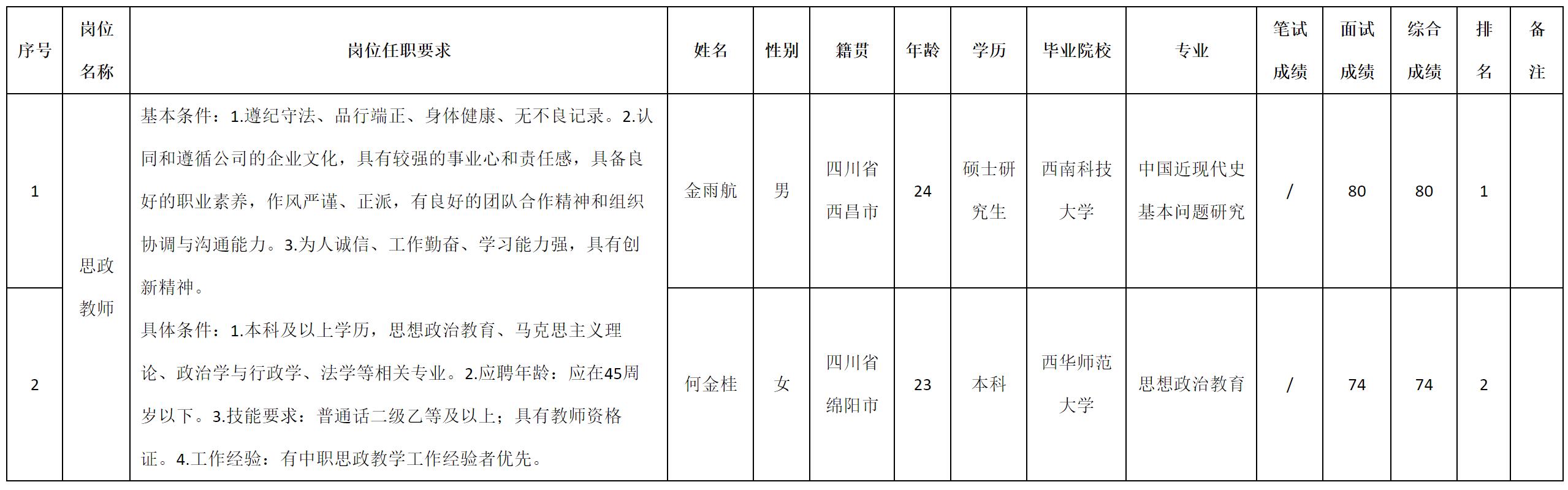根據(jù)四川九洲教育投資管理有限公司發(fā)布的招聘公告及招聘相關(guān)規(guī)定,現(xiàn)將測(cè)試成績(jī)予以公示。