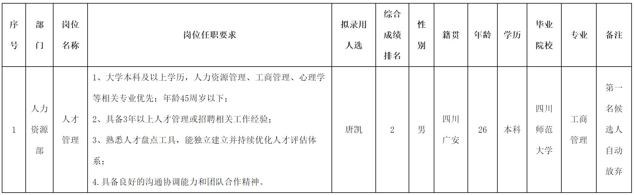 根據(jù)四川華豐科技股份有限公司發(fā)布的招聘公告及招聘相關(guān)規(guī)定,經(jīng)測(cè)試等程序,擬錄用唐凱同志到四川華豐科技股份有限公司工作,現(xiàn)予以公示,具體情況如下: