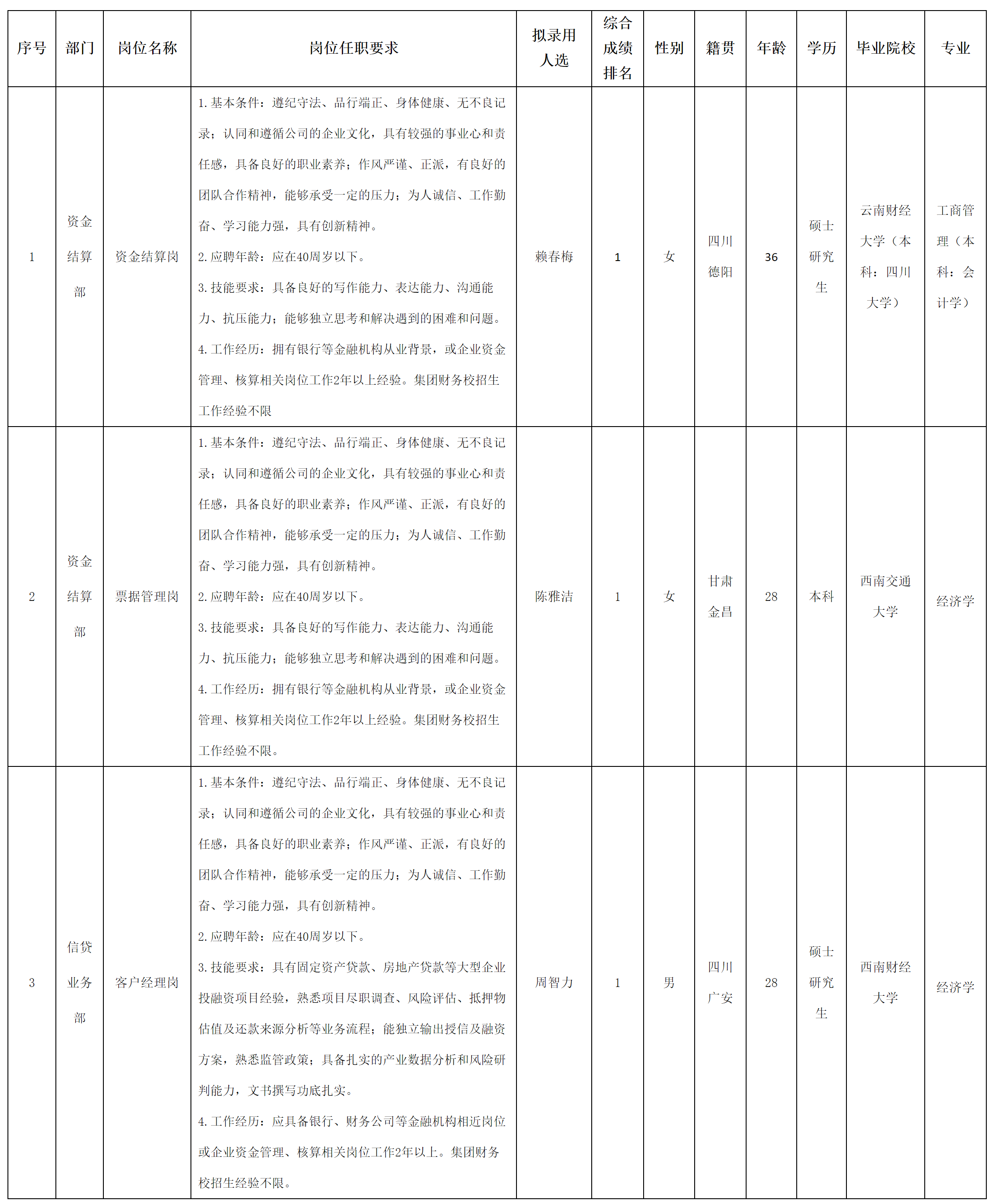 根據(jù)四川長虹集團(tuán)財務(wù)有限公司發(fā)布的招聘公告及招聘相關(guān)規(guī)定,經(jīng)面試、考察、體檢等程序,擬錄用賴春梅、陳雅潔、周智力3位同志到長虹財務(wù)公司工作,現(xiàn)予以公示,具體情況如下: