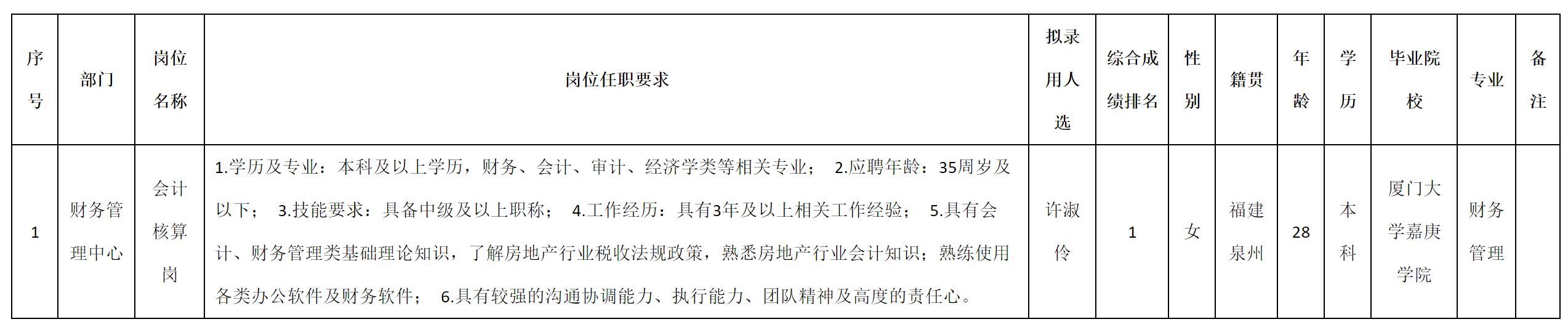 根據(jù)九洲千城置業(yè)有限責任公司發(fā)布的招聘公告及招聘相關規(guī)定,經(jīng)測試、考察、體檢等程序,擬錄用許淑伶同志到九洲千城置業(yè)有限責任公司工作,現(xiàn)予以公示,具體情況如下:
