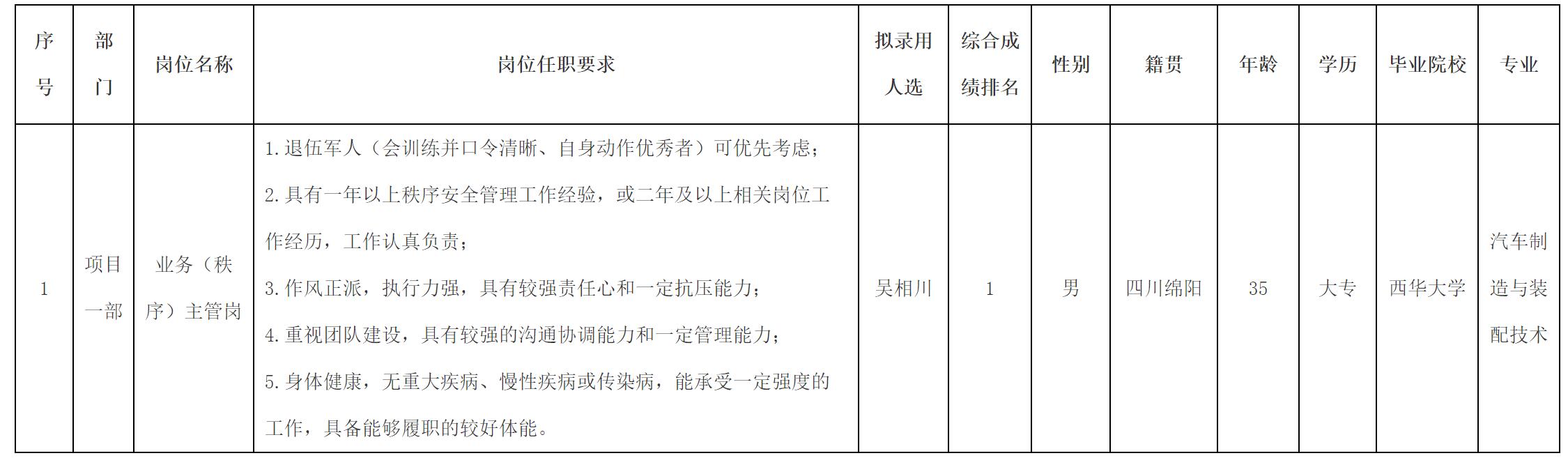 根據綿陽市康來物業(yè)服務有限公司發(fā)布的招聘公告及招聘相關規(guī)定,經筆試、面試、背景調查等程序,擬錄用吳相川同志到綿陽市康來物業(yè)服務有限公司工作,現(xiàn)予以公示,具體情況如下: