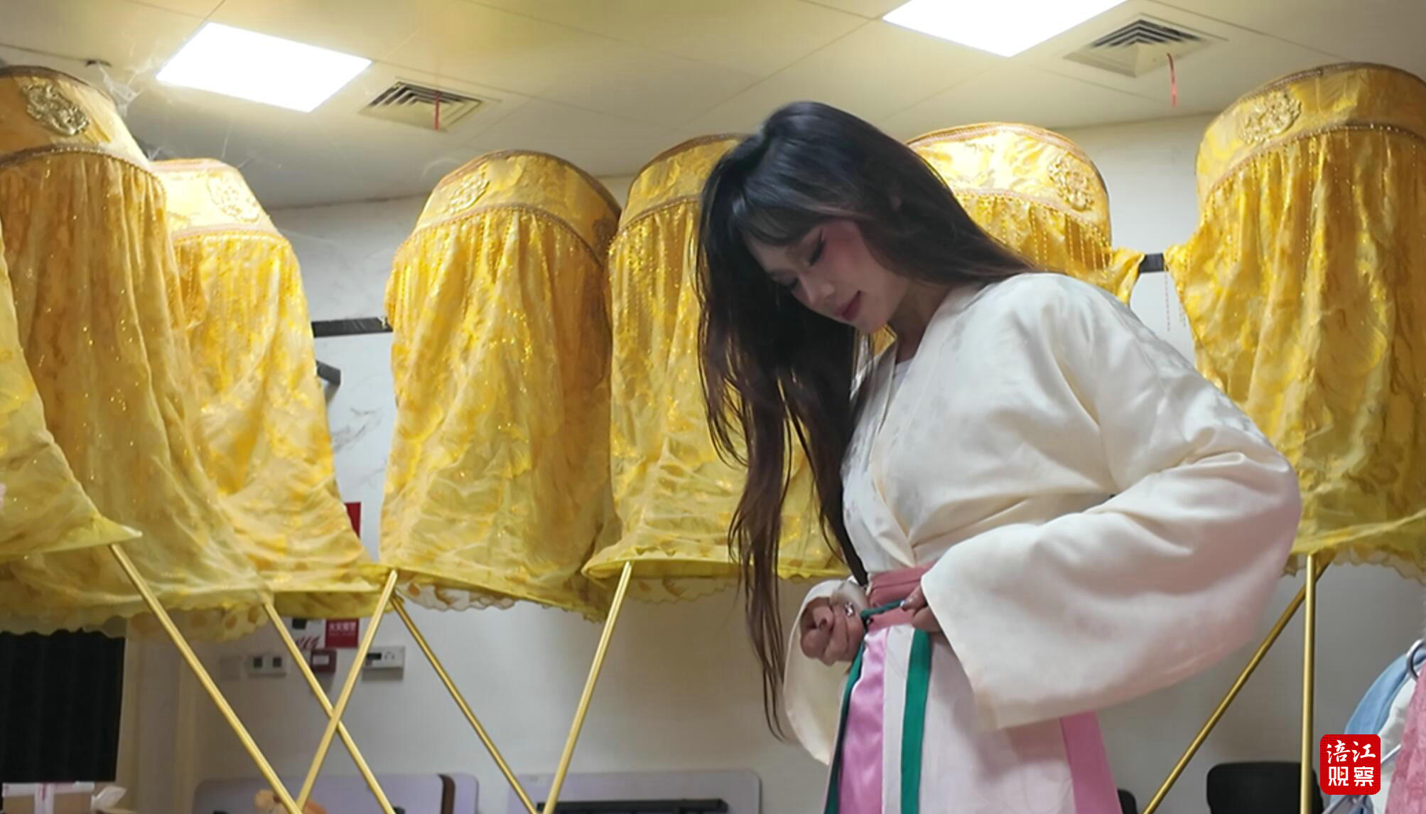 安夢逾坐在鏡子前,熟練地描眉、涂唇、撲腮紅,動作行云流水。面對即將開場的演出,她顯得從容不迫。童年開始苦練舞蹈,多年的積累沉淀讓她有了這樣的從容與自信。“因為從小喜歡跳舞,越跳越喜歡,越跳越習慣。”她輕聲說道。