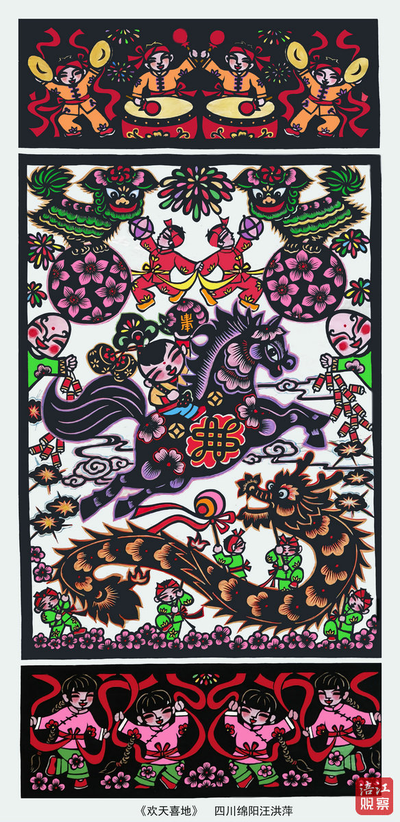 剪紙作品《歡天喜地》生動展現(xiàn)了川西北地區(qū)春節(jié)的民俗場景,畫面分為上、中、下三部分:上部為敲鑼打鼓的喜慶場面,下部是扭秧歌的熱鬧場景,均以五彩斑斕的煙花烘托節(jié)日氣氛;中部以“福娃騎駿馬”為視覺核心,福娃肩扛如意與雙柿,手托壽桃,寓意“事事如意、健康長壽”。駿馬飾以花卉與中國結(jié),象征紅火吉祥。左右伴有提鞭炮的“笑頭”,更添歡快氣氛。此外,畫面中還有“獅子踩繡球”、“龍舞表演”等傳統(tǒng)元素,底部盛開的寒梅則預(yù)示著春的希望。
