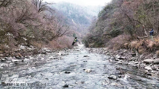 循著水聲走向泗耳溝深處,隊伍攀爬近乎垂直的陡坡,踏過覆冰的河灘,被一道30米寬的急流攔住了去路。