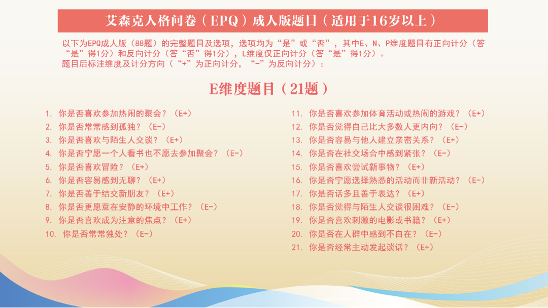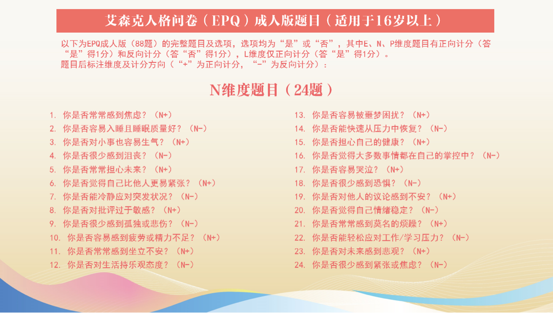 艾森克的人格問卷是用的比較多的一個(gè)測(cè)評(píng),它分了四個(gè)維度,每個(gè)維度都有二十多道題,總共的這個(gè)問卷就有八十多道題。這樣的評(píng)估跟那個(gè)圖的評(píng)估相比,對(duì)于我們精神科醫(yī)生來講,我們會(huì)認(rèn)為都不太可靠。比如這題問你是否擔(dān)心自己的健康?我在做這個(gè)選項(xiàng)的時(shí)候,我可能會(huì)想,我勾選我擔(dān)心自己的健康會(huì)不會(huì)被醫(yī)生認(rèn)為我有病,我就選什么,我就選不,我就選否。