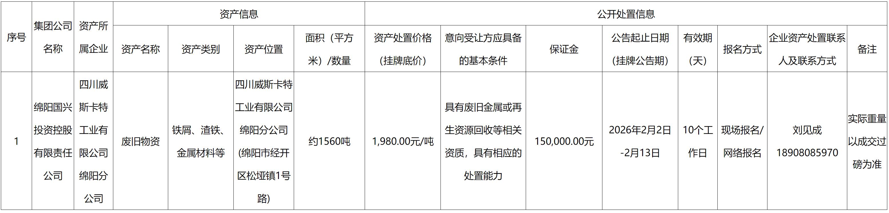 綿陽國興投資控股有限責(zé)任公司資產(chǎn)處置公告