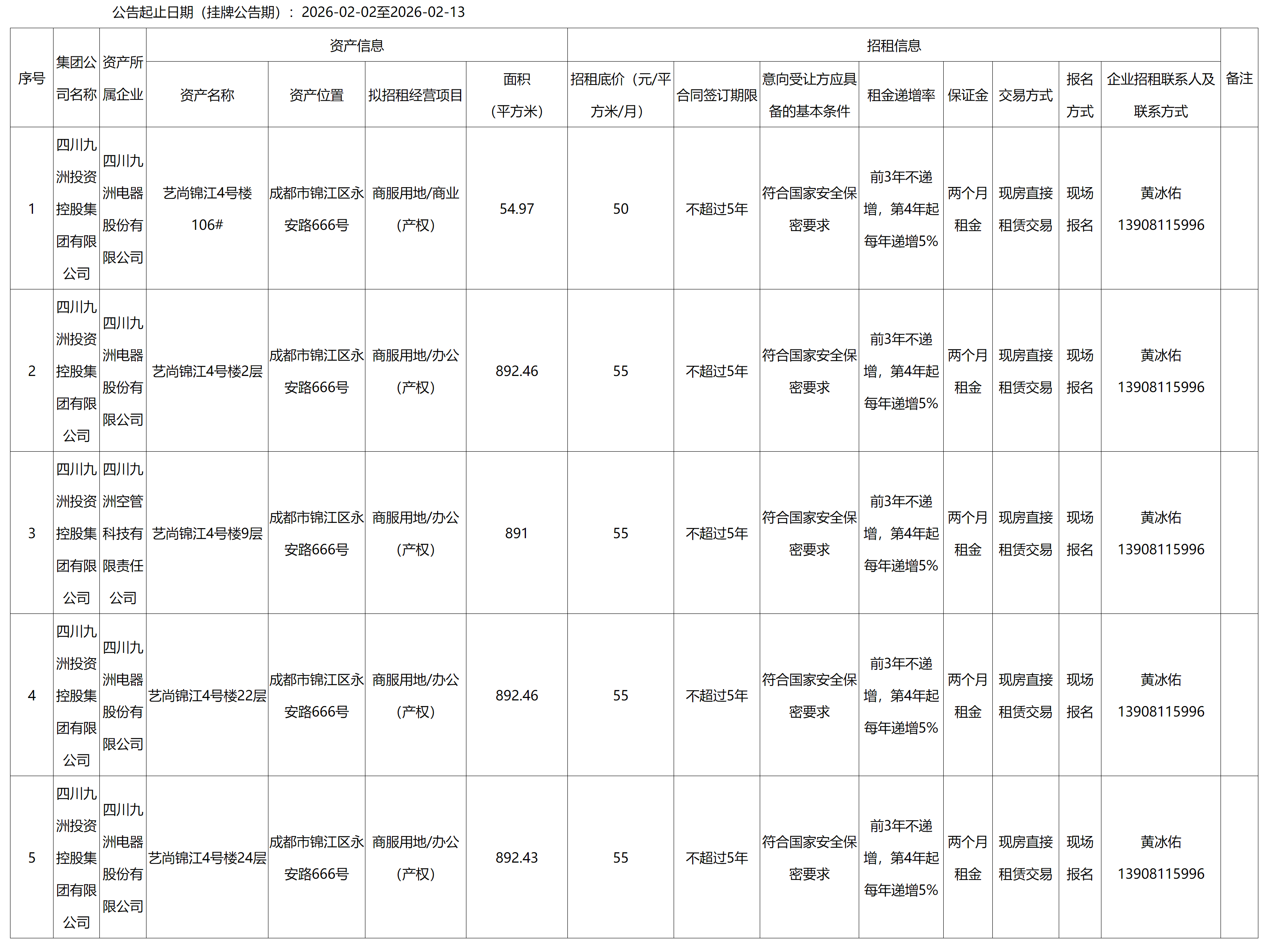 四川九洲千城商業(yè)管理有限公司成都項目部藝尚錦江4#樓房屋出租公告