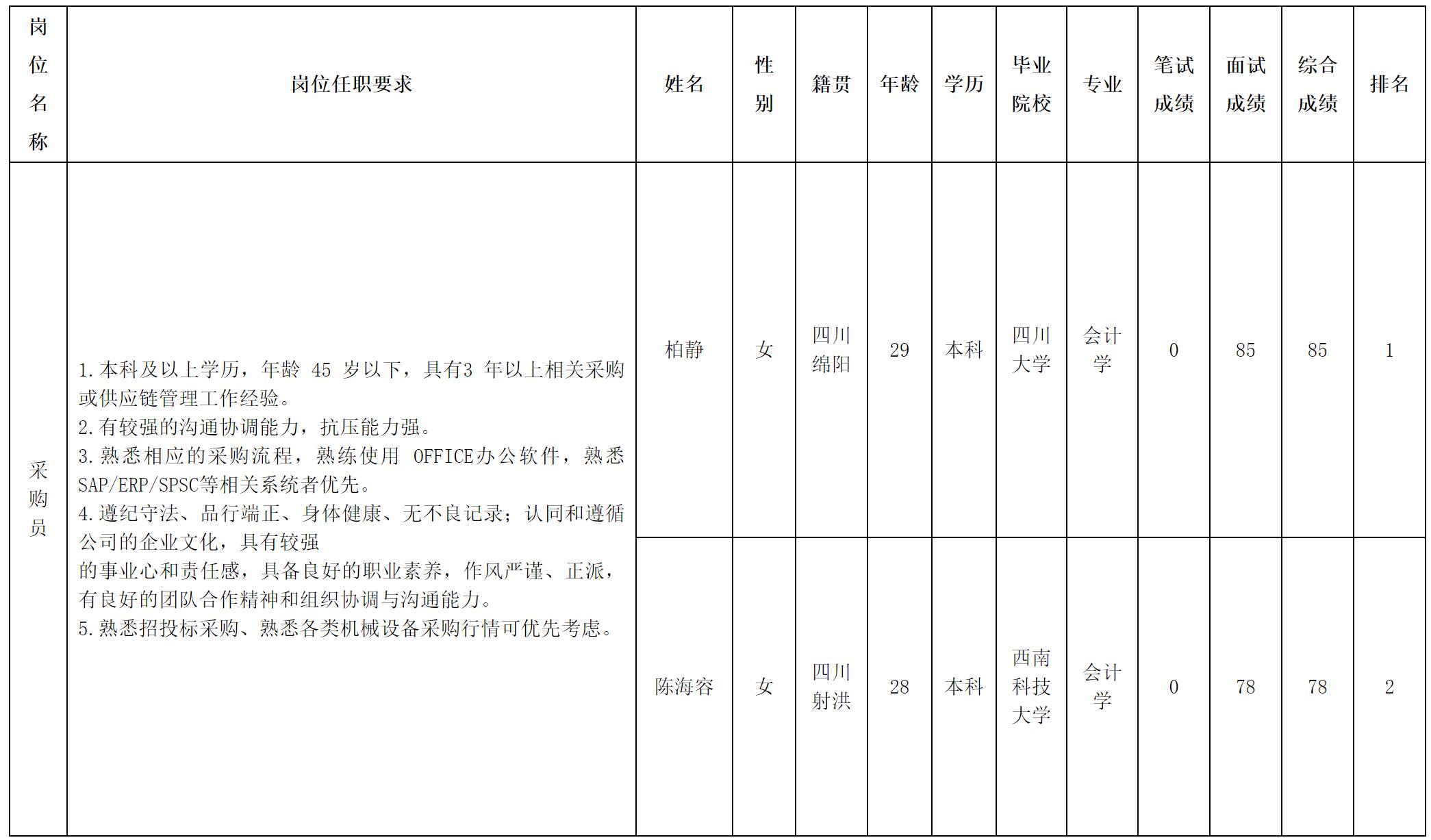 根據四川華豐科技股份有限公司發(fā)布的招聘公告及招聘相關規(guī)定,經面試等程序,現將測試成績予以公示。