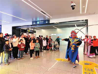 綿陽(yáng)南郊機(jī)場(chǎng),川劇變臉獲旅客點(diǎn)贊。記者 唐舒琪 攝