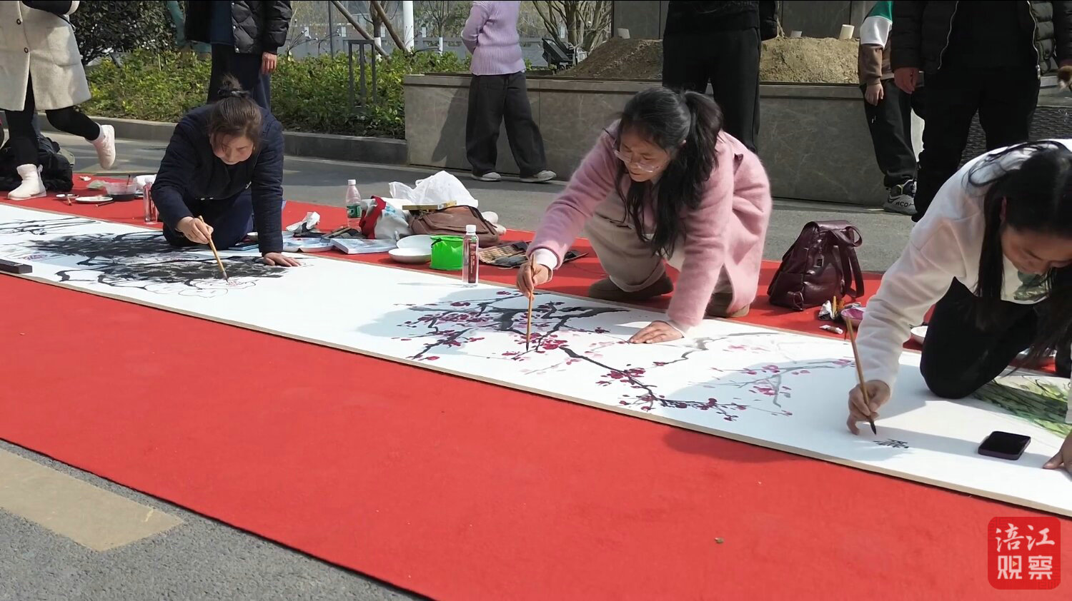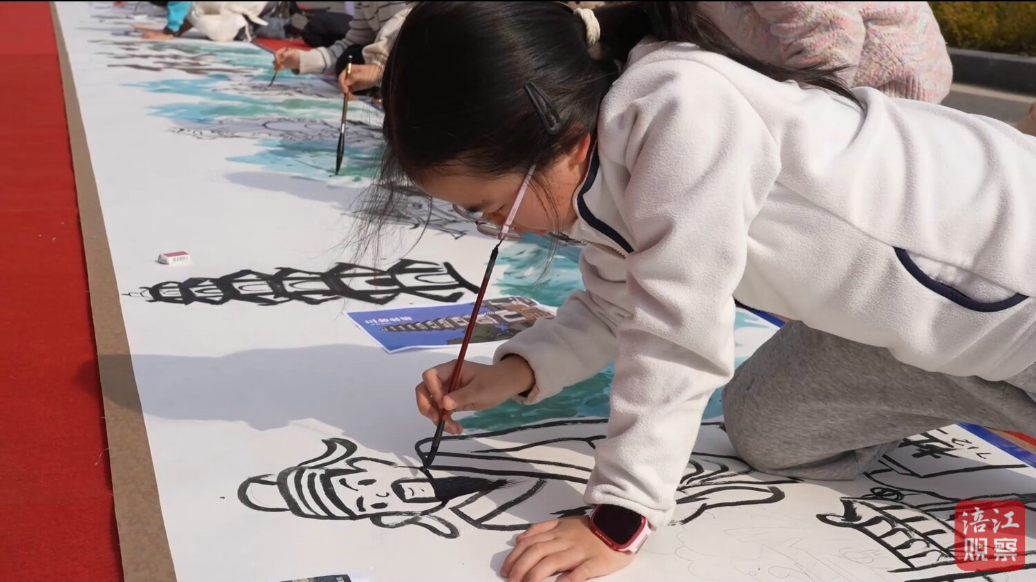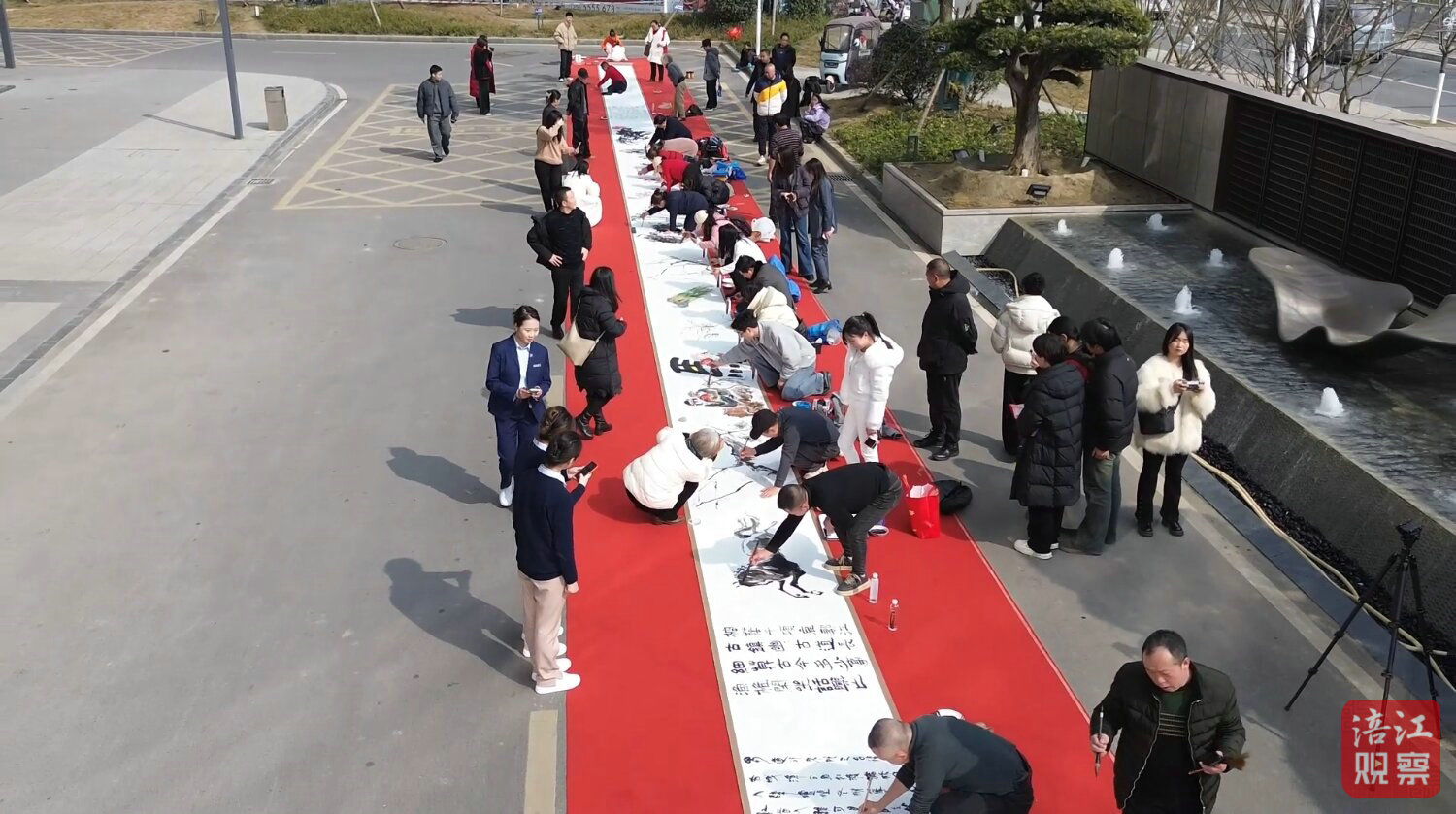 活動(dòng)現(xiàn)場(chǎng),一幅百米長(zhǎng)卷在地面鋪展開來,參與者們提筆蘸墨、傾情創(chuàng)作。靈動(dòng)的花鳥、遒勁的詩(shī)句、奔騰的駿馬、熟悉的三臺(tái)標(biāo)志性建筑躍然紙上,馬年的吉祥寓意與家鄉(xiāng)的人文風(fēng)貌在畫卷上交相輝映。