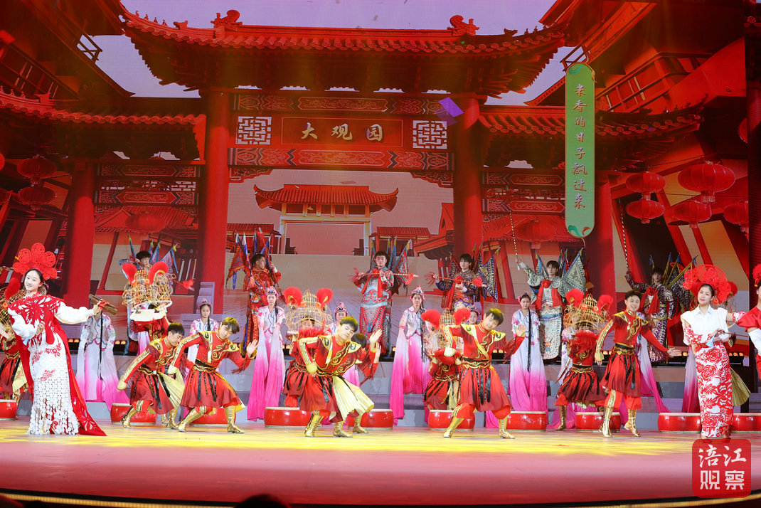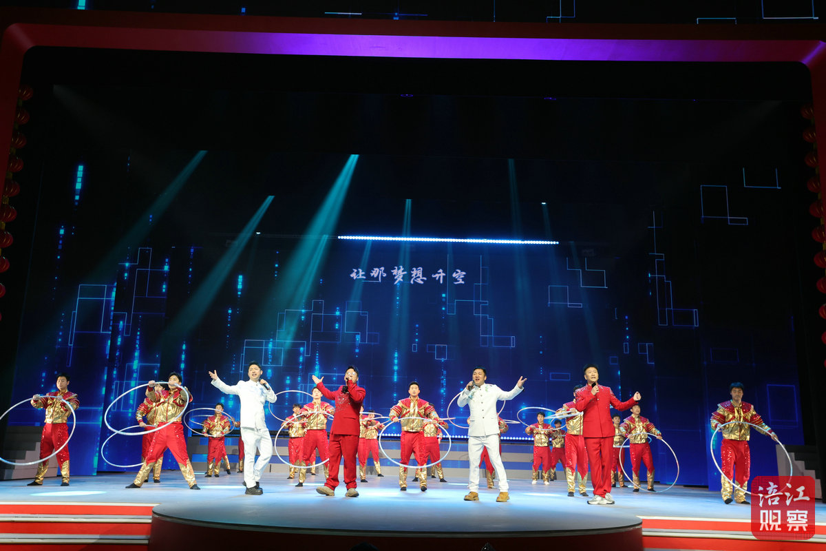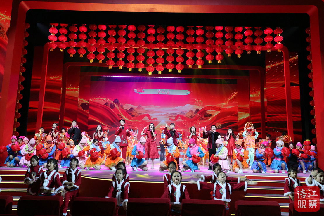 當天14時30分,隨著“新年鐘聲”響起,舞臺上近400個大紅燈籠組成的燈籠墻緩緩升起,一陣清脆的馬蹄聲中,演員們手持對聯(lián)、繡球、魚燈逶迤而出。124人演繹的開場歌舞《金馬踏春賀新年》,以豐富的舞臺表達和飽滿的視覺語言烘托出喜慶、祥和的節(jié)日氛圍。