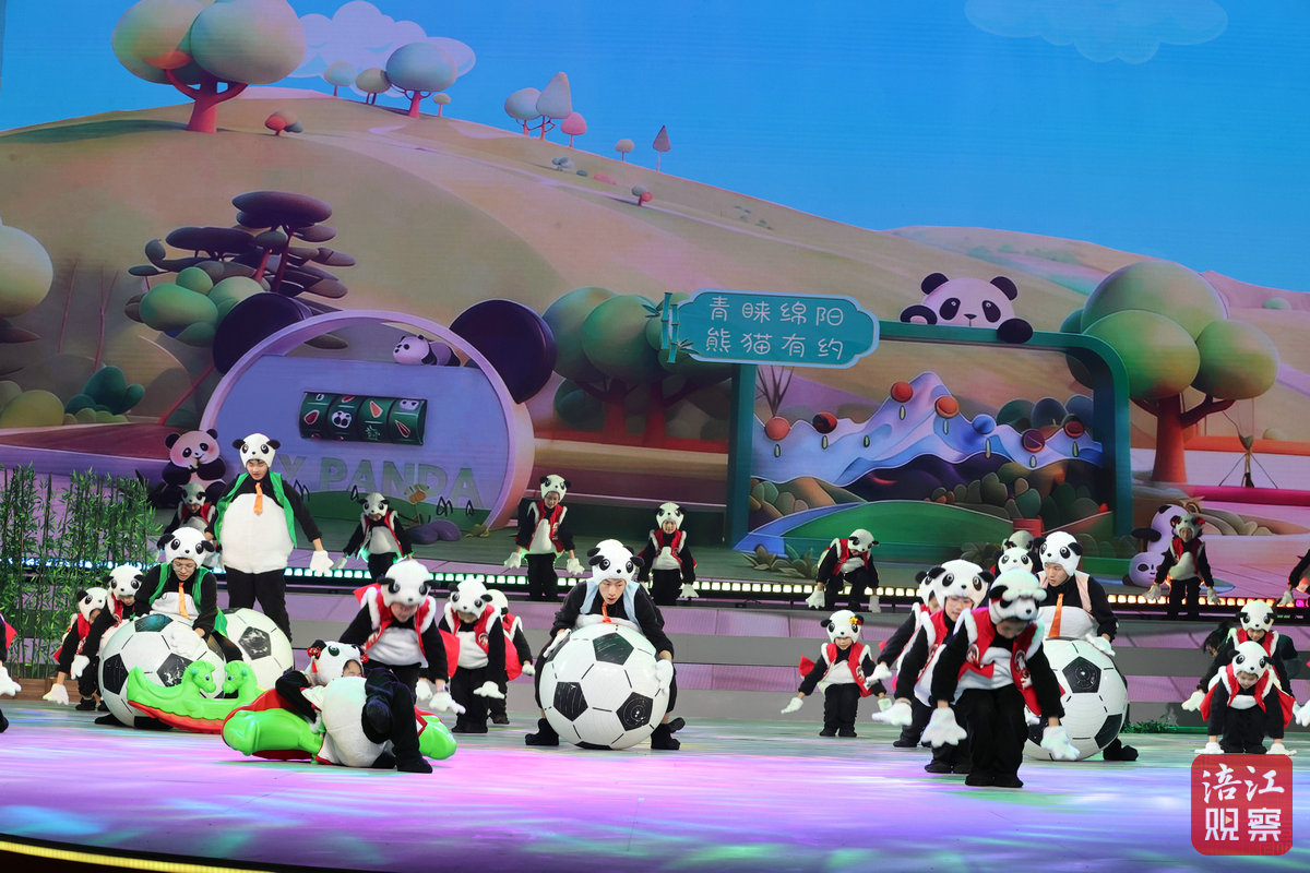 ◎情景少兒歌舞《你好呀,朋友》以綿陽中華大熊貓苑的熊貓為原型,通過人偶裝扮的熊貓?zhí)咦闱?、耍雜技、變魔術、拉大提琴、跳芭蕾等表演,展現(xiàn)綿陽的自然生態(tài)之美,呈現(xiàn)人與自然和諧共生的畫面。
