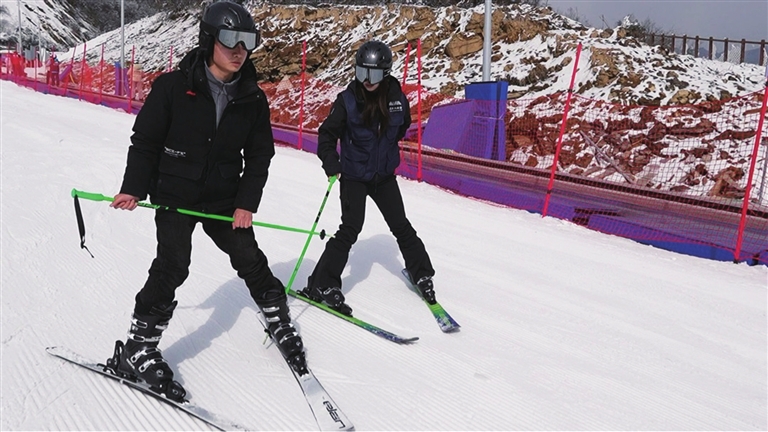 來自東北的滑雪教練(右)指導(dǎo)游客滑雪。記者 彭紫薇 攝