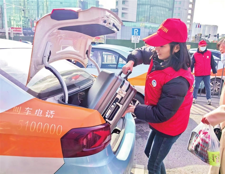 2月10日上午,隨著一趟趟列車安全抵達(dá),綿陽火車站站前廣場的出租車乘坐點(diǎn)排起了長隊(duì)。“您好,請走這邊上車,行李交給我來幫您放在后備箱。”綿陽空港出租車有限公司志愿者鄧春燕快步走到一位乘客身邊,開車門、放行李、示意車輛出發(fā),整個動作一氣呵成。遠(yuǎn)遠(yuǎn)望去,偌大的候車區(qū)還有很多身穿紅馬甲的志愿者穿梭在車流中,他們有的負(fù)責(zé)指揮出租車有序進(jìn)場,有的忙著搬運(yùn)大包小包的行李,有的幫助行動不便的旅客上車。“每次看到乘客順利上車、踏上回家的路,我就覺得特別溫暖。”鄧春燕笑著分享道。